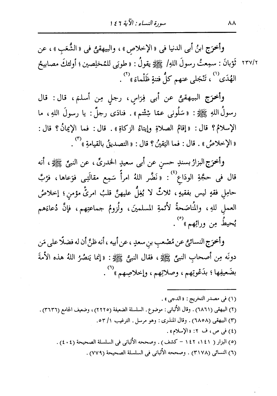 وأخرج ابن أبي الدينا في الإخلاص والبيهقي في الشعب عن ثوبان سمعت رسول الله صلى الله عليه وسلم يقول : طوبى للمخلصين أولئك مصابيح الهدى تنجلي عنهم كل فتنة ظلماء.