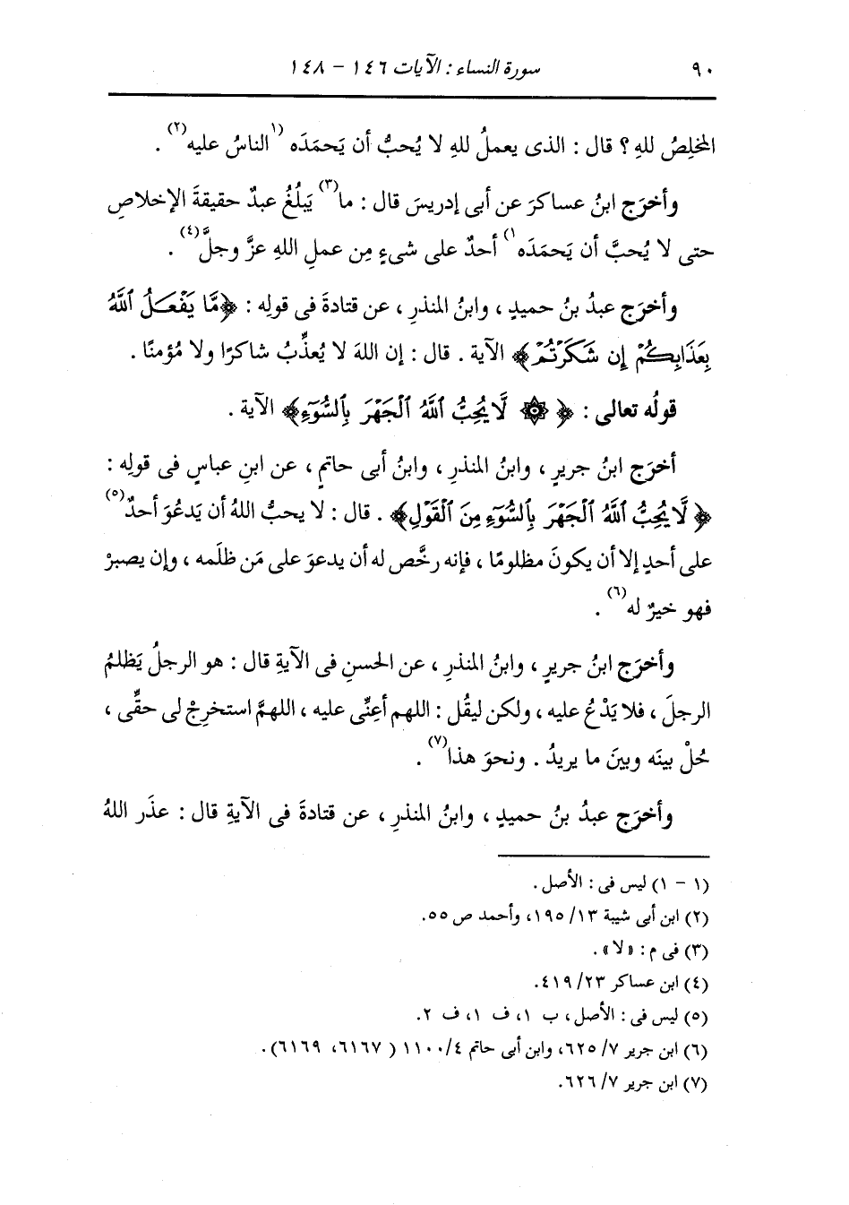 أَخْرَج ابن جرير ، وَابن المنذر ، وَابن أبي حاتم عن ابن عباس في قوله : (لايحب الله الجهر بالسوء من القول) ، قال : لا يحب الله أن يدعو أحد على أحد إلا أن يكون مظلوما فإنه رخص له أن يدعو على من ظلمه وأن يصبر فهو خير له.