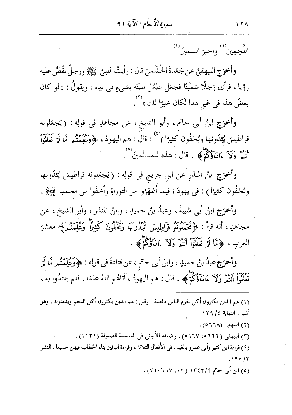وأخرج ابن أبي حاتم وأبو الشيخ عن مجاهد في قوله {تجعلونه قراطيس تبدونها وتخفون كثيرا} قال : هم اليهود {وعلمتم ما لم تعلموا أنتم ولا آباؤكم} قال : هذه للمسلمين.