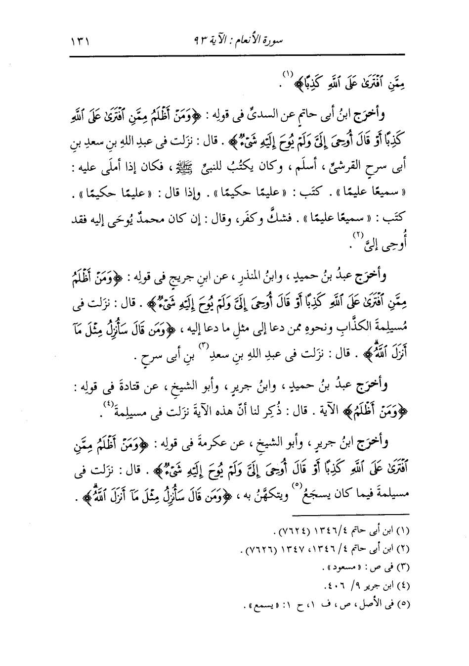 وأخرج ابن أبي حاتم عن السدي في قوله {ومن أظلم ممن افترى على الله كذبا أو قال أوحي إلي ولم يوح إليه شيء} قال : نزلت في عبد الله بن سعد بن أبي سرح القرشي أسلم وكان يكتب للنبي صلى الله عليه وسلم فكان إذا أملى عليه {سميعا عليما} كتب (عليما حكيما) وإذا قال {عليما حكيما} كتب (سميعا عليما) فشك وكفر وقال : إن كان محمد يوحى إليه فقد أوحي إلي.