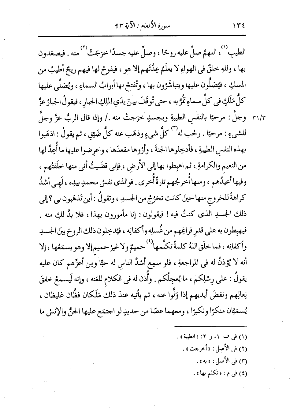 الطيب اللهم صل عليه روحا وصل عليه جسدا خرجت منه فيصعدون بها ولله خلق في الهواء لا يعلم عدتهم إلا هو فيفوح لها فيهم ريح أطيب من المسك فيصلون عليها ويتباشرون بها ويفتح لها أبواب السماء ويصلي عليها كل ملك في كل سماء تمر به حتى توقف بين يدي الملك الجبار فيقول الجبار عز وجل : مرحبا بالنفس الطيبة وبجسد خرجت منه وإذا قال الرب عز وجل للشيء : مرحبا ، رحب له كل شيء وذهب عنه كل ضيق ثم يقول : اذهبوا بهذه النفس الطيبة فأدخلوها الجنة وأروها مقعدها واعرضوا عليها ما أعد لها من النعيم والكرامة ثم اهبطوا بها إلى الأرض فإني قضيت أني منها خلقتهم وفيها أعيدهم ومنها أخرجهم تارة أخرى فو الذي نفس محمد بيده هي أشد كراهة للخروج منها حين كانت تخرج من الجسد وتقول : أين تذهبون بي إلى ذلك الجسد الذي كنت فيه فيقولون : إنا مأمورون بهذا فلا بد لك منه ، فيهبطون به على قدر فراغهم من غسله وأكفانه فيدخلون ذلك الروح بين الجسد وأكفانه فما خلق الله تعالى كلمة تكلم بها حميم ولا غير حميم إلا وهو يسمعها إلا أنه لا يؤذن له في المراجعة فلو سمع أشد الناس له حبا ومن أعزهم كان عليه يقول : على رسلكم ما يعجلكم وأذن له في الكلام للعنه وإنه يسمع خفق نعالهم ونفض أيديهم إذا ولوا عنه ، ثم يأتيه عند ذلك ملكان فظان غليظان يسميان منكرا ونكيرا ومعهما عصا من حديد لو اجتمع عليها الجن والإنس ما