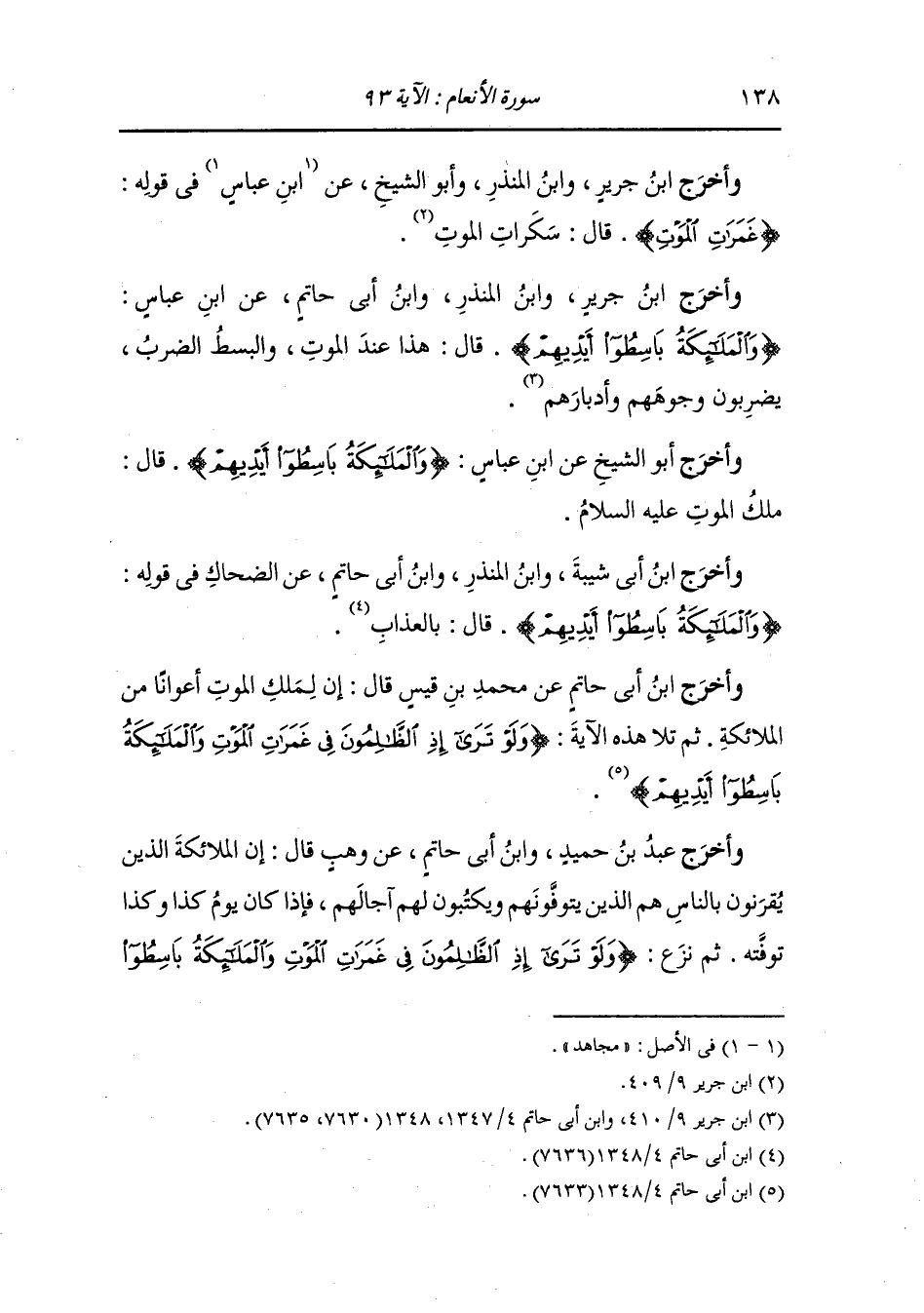 وأخرج ابن جرير ، وَابن المنذر ، وَابن أبي حاتم عن ابن عباس {والملائكة باسطوا أيديهم} قال : هذا عند الموت ، والبسط الضرب ، يضربون وجوههم وأدبارهم.