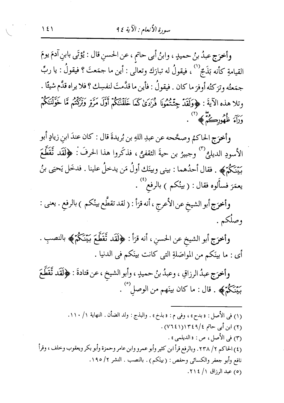 وأخرج عبد الرزاق ، وعَبد بن حُمَيد وأبو الشيخ عن قتادة رضي الله عنه (لقد تقطع بينكم) قال : ما كان بينهم من الوصل