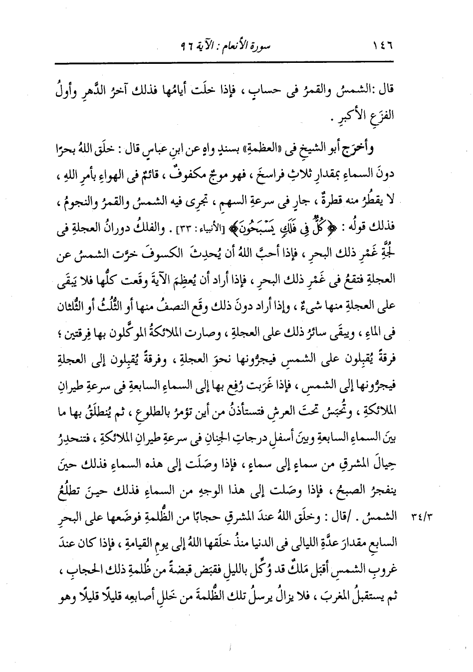 وأخرج أبو الشيخ في العظمة بسند واه عن ابن عباس قال : خلق الله بحرا دون السماء بمقدار ثلاث فراسخ فهو موج مكفوف قائم في الهواء بأمر الله لا يقطر منه قطرة جار في سرعة السهم تجري فيه الشمس والقمر والنجوم فذلك قوله {كل في فلك يسبحون} الأنبياء الآية 33 والفلك دوران العجلة في لجة غمر ذلك البحر فإذا أحب الله أن يحدث الكسوف خرت الشمس عن العجلة فتقع في غمر ذلك البحر فإذا أراد أن يعظم الآية وقعت كلها فلا يبقى على العجلة منها شيء وإذا أراد دون ذلك وقع النصف منها أو الثلث أو الثلثان في الماء ويبقى سائر ذلك على العجلة وصارت الملائكة الموكلين بها فرقتين فرقة يقبلون على الشمس فيجرونها نحو العجلة وفرقة يقبلون إلى العجلة فيجرونها إلى الشمس فإذا غربت رفع بها إلى السماء السابعة في سرعة طيران الملائكة وتحبس تحت العرش فتستأذن من أين تؤمر بالطلوع ثم ينطلق بها ما بين السماء السابعة وبين أسفل درجات الجنان في سرعة طيران الملائكة فتنحدر حيال المشرق من سماء إلى سماء فإذا وصلت إلى هذه السماء فذلك حين ينفجر الصبح فإذا وصلت إلى هذا الوجه من السماء فذلك حين تطلق الشمس قال : وخلق الله عند المشرق حجابا من الظلمة فوضعها على البحر السابع مقدار عدة الليالي في الدنيا منذ خلقها إلى يوم القيامة فإذا كان عند غروب الشمس أقبل ملك قد وكل بالليل فقبض قبضة من ظلمة ذلك الحجاب ثم يستقبل الغرب فلا يزال يرسل تلك الظلمة من خلل أصابعه قليلا قليلا وهو