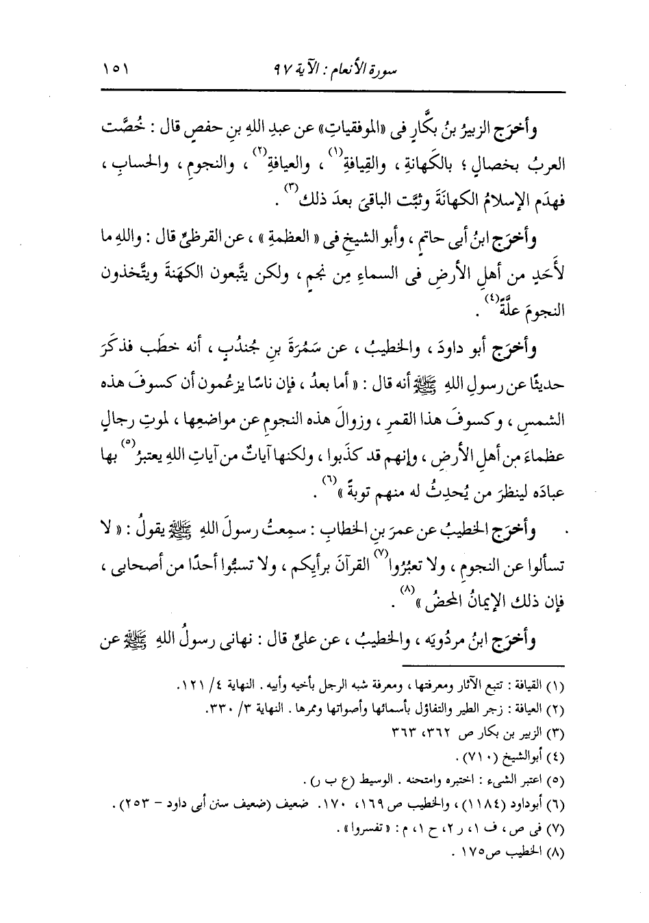 وأخرج الزبير بن بكار في المفقيات عن عبد الله بن حفص قال : خصت العرب بخصال بالكهانة والقيافة والعيافة والنجوم والحساب فهدم الإسلام الكهانة وثبت الباقي بعد ذلك.