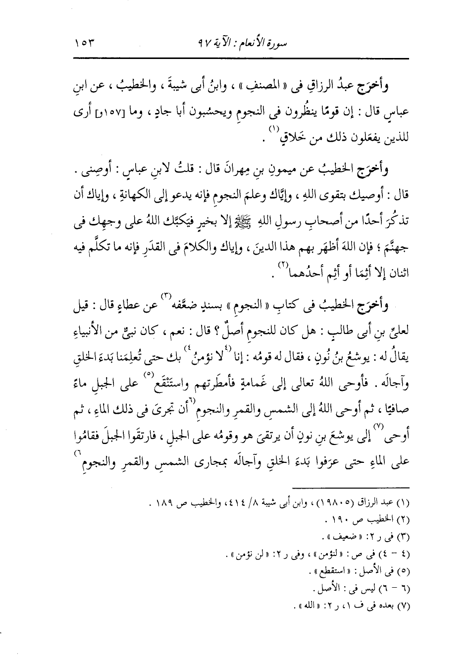 وأخرج عبد الرزاق في المصنف ، وَابن أبي شيبة والخطيب عن ابن عباس قال : إن قوما ما ينظرون في النجوم ويحسبون أبراجا وما أرى الذين يفعلون ذلك من خلاق.