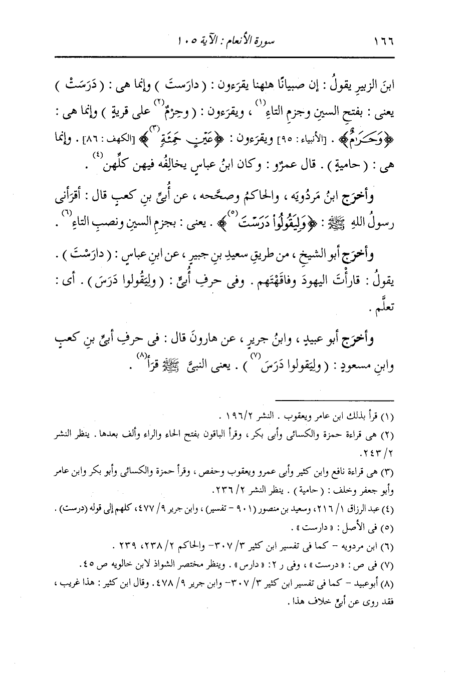 بن الزبير يقول : إن صبيانا ههنا يقرأون (دارست) وإنما هي {درست} يعني بفتح السين وجزم التاء ويقرأون (وحرم على قرية) (الأنبياء الآية 59) وإنما هي {وحرام} ويقرأون (في عين حمئة) وإنما هي {حامية} قال عمرو : وكان ابن عباس يخالفه فيهن كلهن.