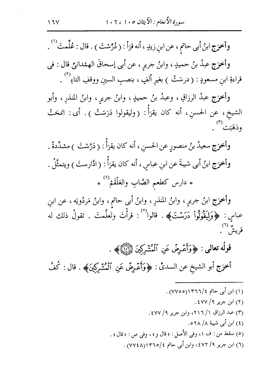 وأخرج ابن جرير ، وَابن المنذر ، وَابن أبي حاتم ، وَابن مردويه عن ابن عباس {وليقولوا درست} قالوا : قرأت وتعلمت تقول ذلك له قريش ، قوله تعالى : {وأعرض عن المشركين}.
