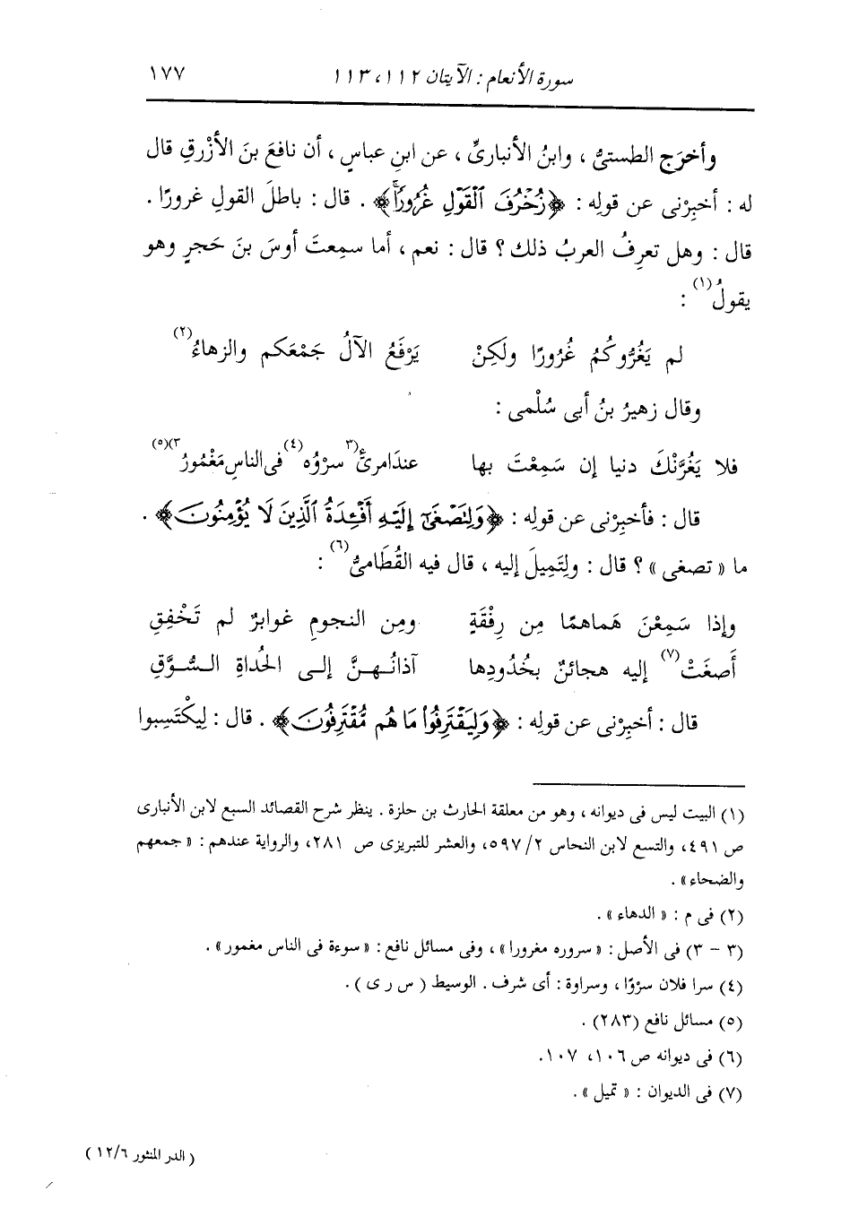 وأخرج الطستي ، وَابن الأنباري عن ابن عباس أن نافع بن الأزرق قال له : أخبرني عن قوله تعالى {زخرف القول غرورا} قال : باطل القول غرورا قال : وهل تعرف العرب ذلك قال : نعم أما سمعت أوس بن حجر وهو يقول : لم يغروكم غرورا ولكن * يرفع الآل جمعكم والدهاء وقال زهير بن أبي سلمى : فلا يغرنك دنيا إن سمعت بها * عند امرى ء سروه في الناس مغمور قال : فأخبرني عن قوله {ولتصغى إليه أفئدة الذين لا يؤمنون} ما تصغي قال : ولتميل إليه ، قال فيه الفطامي : واذا سمعن هما هما من رفقة * ومن النجوم غوابر لم تخفق أصغت إليه هجائن بخدودها * آذانهن إلى الحداة السوق قال : أخبرني عن قوله {وليقترفوا ما هم مقترفون} قال : ليكتسبوا