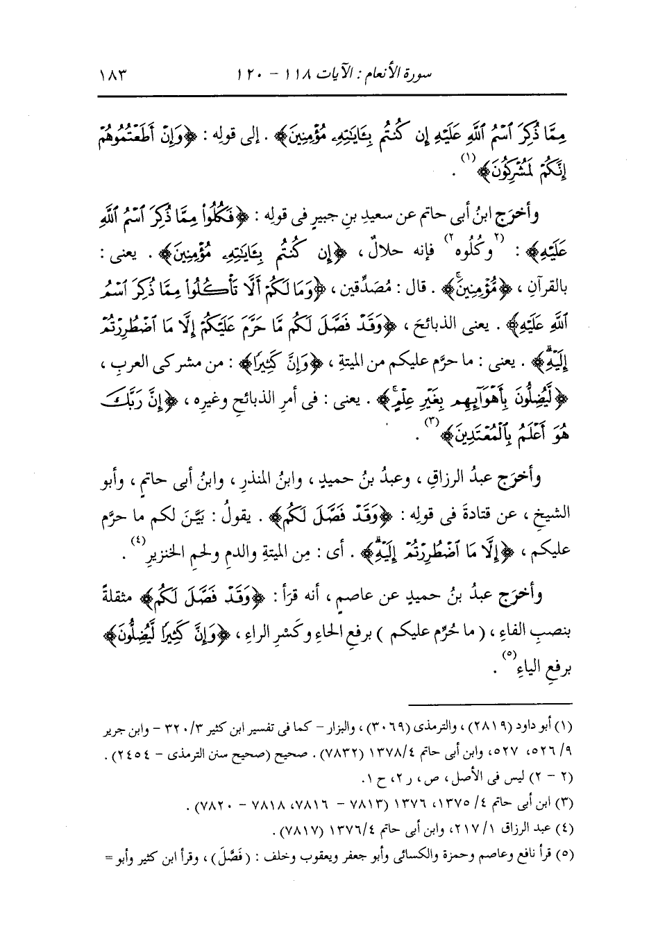 وأخرج ابن أبي حاتم عن سعيد بن جبير في قوله {فكلوا مما ذكر اسم الله عليه} فإنه حلال {إن كنتم بآياته مؤمنين} يعني بالقرآن مصدقين {وما لكم ألا تأكلوا مما ذكر اسم الله عليه} يعني الذبائح {وقد فصل لكم ما حرم عليكم إلا ما اضطررتم إليه} يعني ما حرم عليكم من الميتة {وإن كثيرا} من مشركي العرب {ليضلون بأهوائهم بغير علم} يعني في أمر الذبائح وغيره {إن ربك هو أعلم بالمعتدين}.