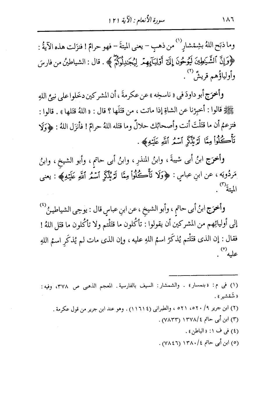 وأخرج أبو داود في ناسخه عن عكرمة إن المشركين دخلوا على نبي الله صلى الله عليه وسلم قالوا : أخبرنا عن الشاة إذا ماتت من قتلها قال : الله قتلها ، قالوا : فتزعم أن ما قتلت أنت وأصحابك حلال وما قتله الله حرام فأنزل الله {ولا تأكلوا مما لم يذكر اسم الله عليه}.