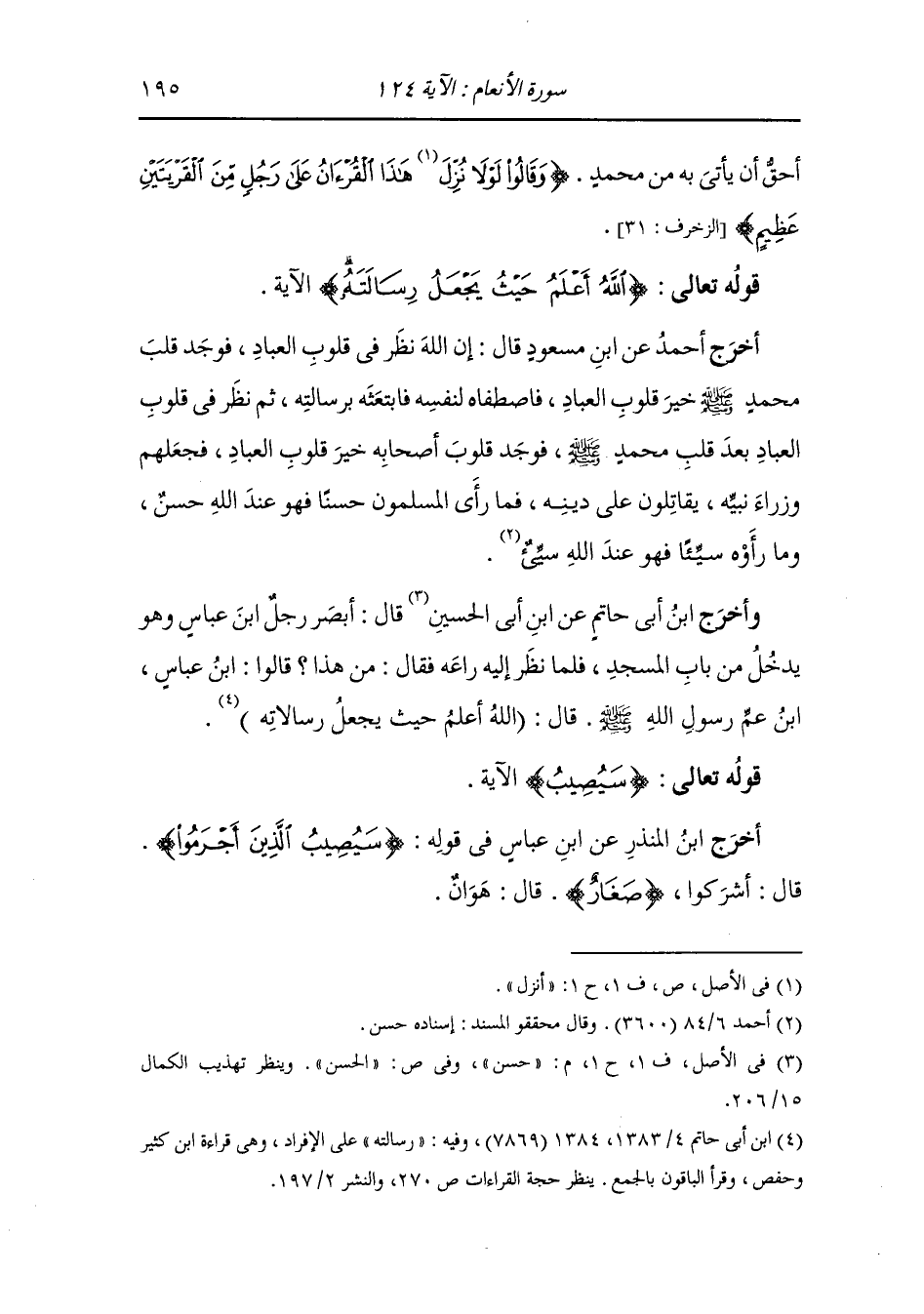 وأخرج ابن أبي حاتم عن ابن أبي حسن قال : أبصر رجل ابن عباس وهو يدخل من باب المسجد فلما نظر إليه راعه فقال : من هذا قالوا : ابن عباس بن عم رسول الله ، قال {الله أعلم حيث يجعل رسالته}.