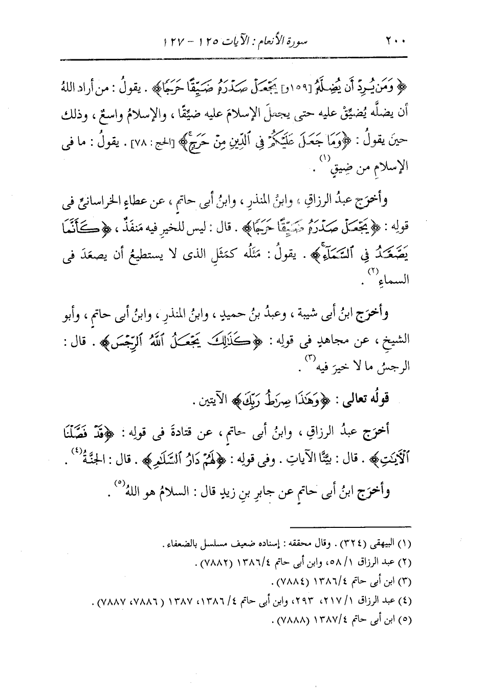 وأخرج عبد الرزاق ، وَابن المنذر ، وَابن أبي حاتم عن عطاء الخراساني في قوله {يجعل صدره ضيقا حرجا} قال : ليس للخير فيه منفذ {كأنما يصعد في السماء} يقول : مثله كمثل الذي لا يستطيع أن يصعد في السماء.