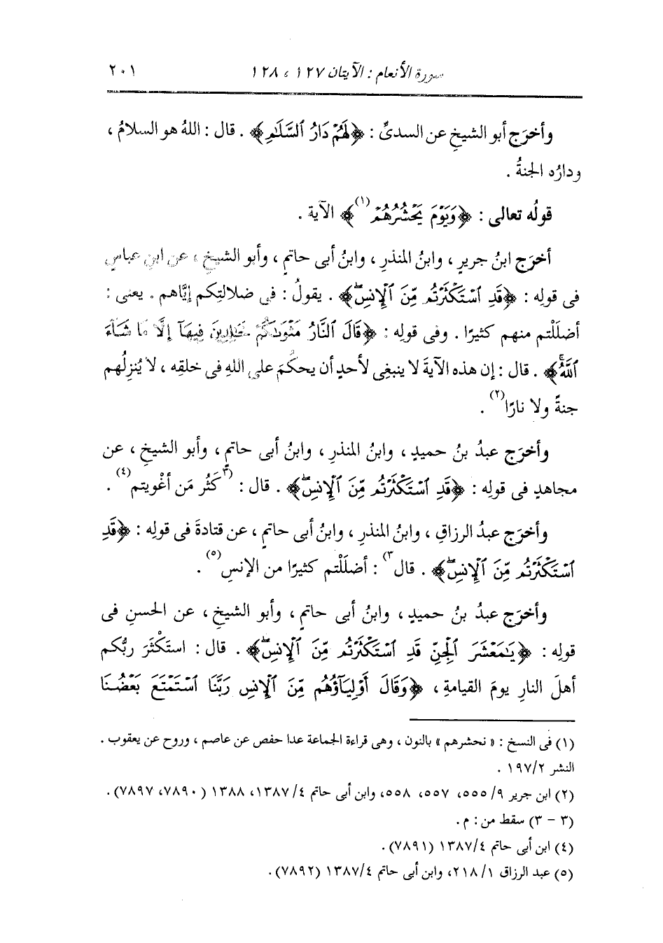 أَخْرَج ابن جرير ، وَابن المنذر ، وَابن أبي حاتم وأبو الشيخ عن ابن عباس في قوله {قد استكثرتم من الإنس} يقول : في ضلالتكم إياهم يعني أضللتم منهم كثيرا ، وفي قوله {قال النار مثواكم خالدين فيها إلا ما شاء الله} قال : إن هذه الآية لا ينبغي لأحد أن يحكم على الله في خلقه لا ينزلهم جنة ولا نارا.