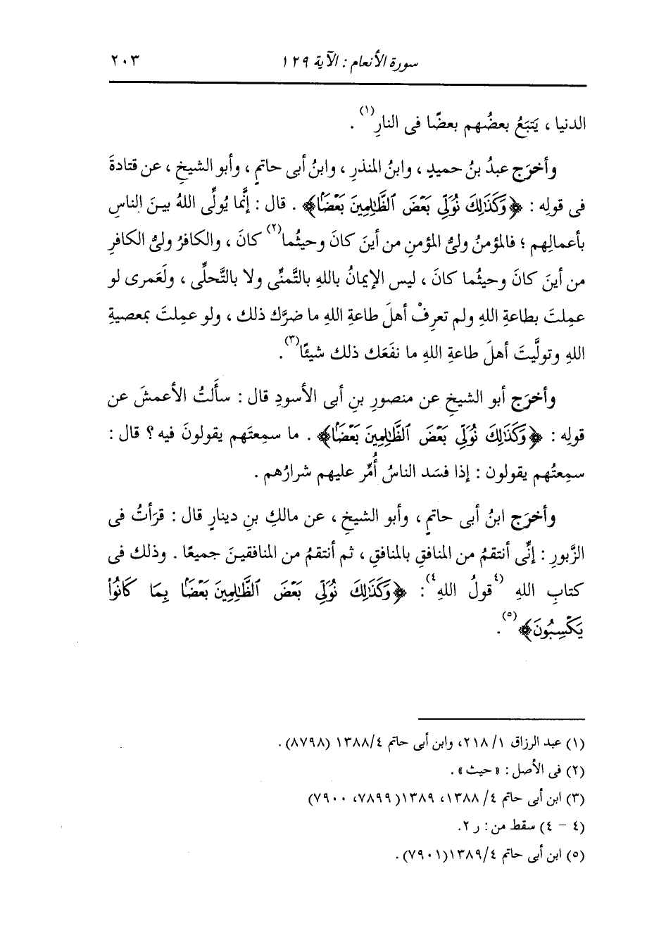 وأخرج أبو الشيخ عن منصور بن أبي الأسود قال : سألت الأعمش عن قوله {وكذلك نولي بعض الظالمين بعضا} ما سمعتهم يقولون فيه قال : سمعتهم يقولون إذا فسد الناس أمر عليهم شرارهم.