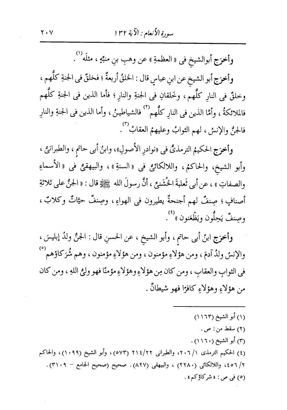 والحاكم واللالكائي في السنة والبيهقي في الأسماء والصفات عن أبي ثعلبة الخشني ، أن رسول الله صلى الله عليه وسلم قال الجن على ثلاثة أصناف ، صنف لهم أجنحة يطيرون في الهواء وصنف حيات وكلاب وصنف يحلون ويظعنون.