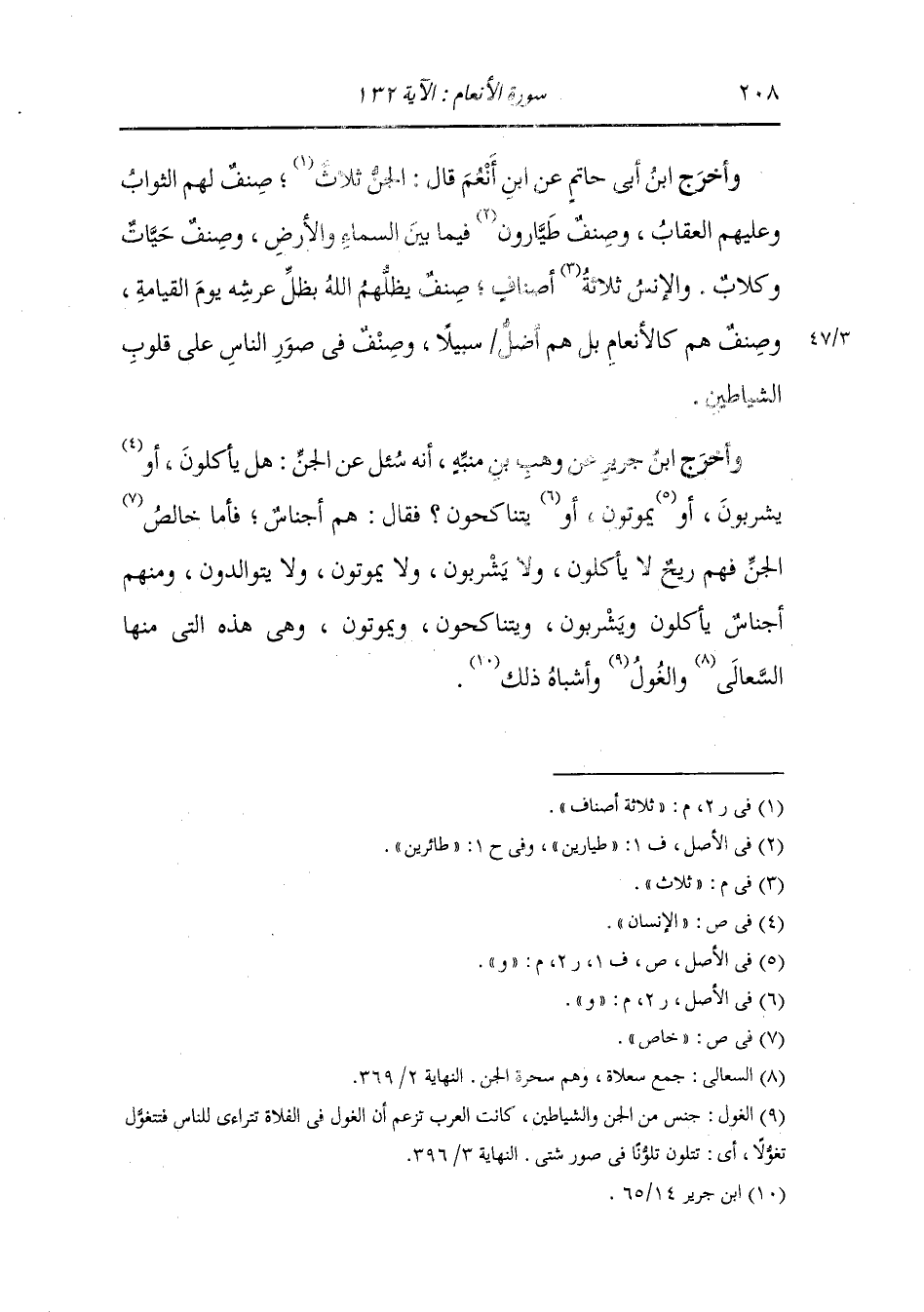 وأخرج ابن جرير عن وهب بن منبه ، أنه سئل عن الجن هل يأكلون ويشربون ويموتون ويتناكحون فقال : هم أجناس فأما خالص الجن فهم ريح لا يأكلون ولا يشربون ولا يموتون ولا يتوالدون ومنهم أجناس يأكلون ويشربون ويتناكحون ويموتون وهي هذه التي منها السعالي والغول وأشباه ذلك