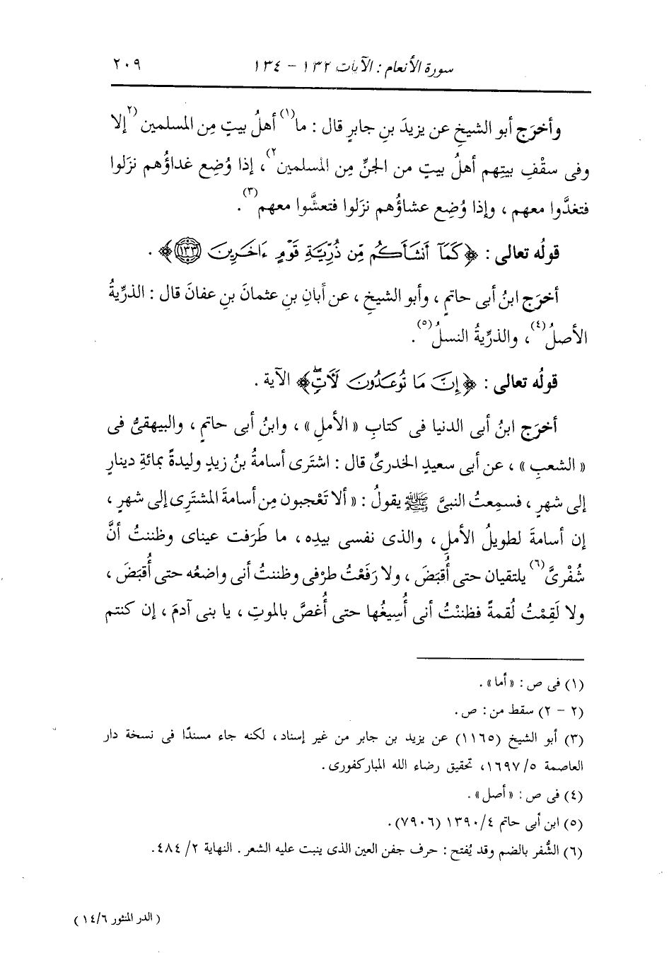 وأخرج أبو الشيخ عن زيد بن جابر قال : ما من أهل بيت من المسلمين إلا وفي سقف بيتهم أهل بيت من الجن من المسلمين إذا وضع غداؤهم نزلوا فتغدوا معهم وإذا وضع عشاؤهم نزلوا فتعشوا معهم ، قوله تعالى : {كما أنشأكم من ذرية قوم آخرين}.