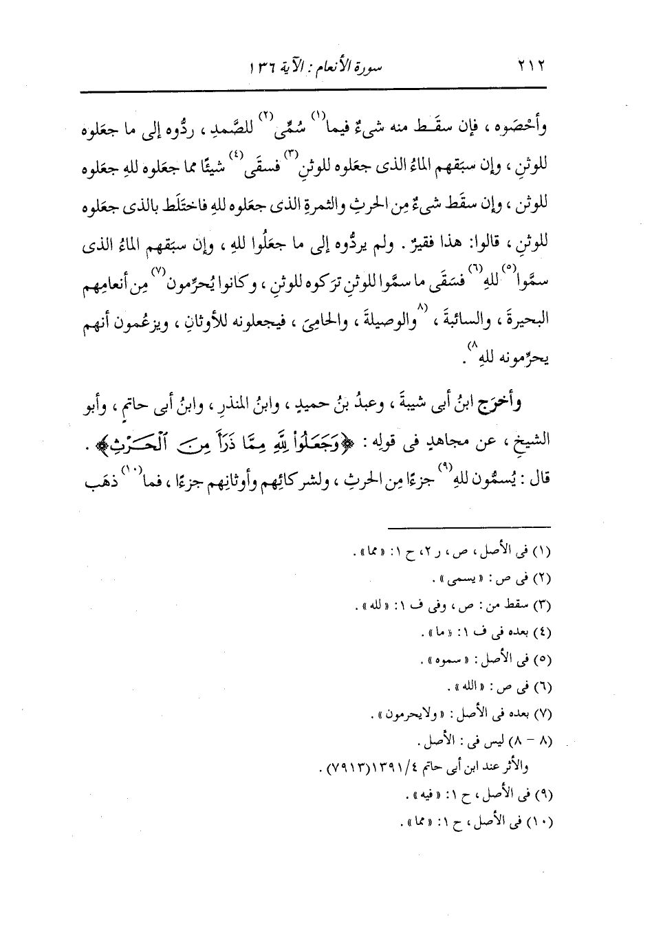وأحصوه فإن سقط منه شيء مما سمي للصمد ردوه إلى ما جعلوه للوثن وإن سبقهم الماء الذي جعلوه للوثن فسقى شيئا مما جعلوه لله جعلوه للوثن وإن سقط شيء من الحرث والثمرة الذي جعلوه لله فاختلط بالذي جعلوه للوثن قالوا : هذا فقير ولم يردوه إلى ما جعلوا لله وإن سبقهم الماء الذي سموا لله فسقى ما سموا للوثن وتركوه للوثن وكانوا يحرمون من أنعامهم البحيرة والسائبة والوصيلة والحامي فيجعلونه للأوثان ويزعمون أنهم يحرمونه لله.