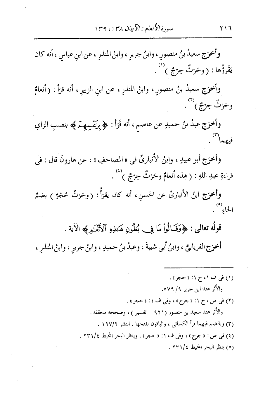 وأخرج سعيد بن منصور ، وَابن المنذر عن ابن الزبير أنه قرأ (أنعام وحرث حرج).