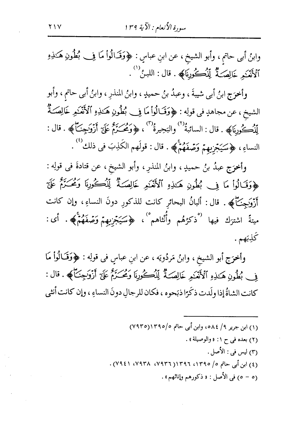وأخرج أبو الشيخ ، وَابن مردويه عن ابن عباس في قوله {وقالوا ما في بطون هذه الأنعام خالصة لذكورنا ومحرم على أزواجنا} قال : كانت الشاة إذا