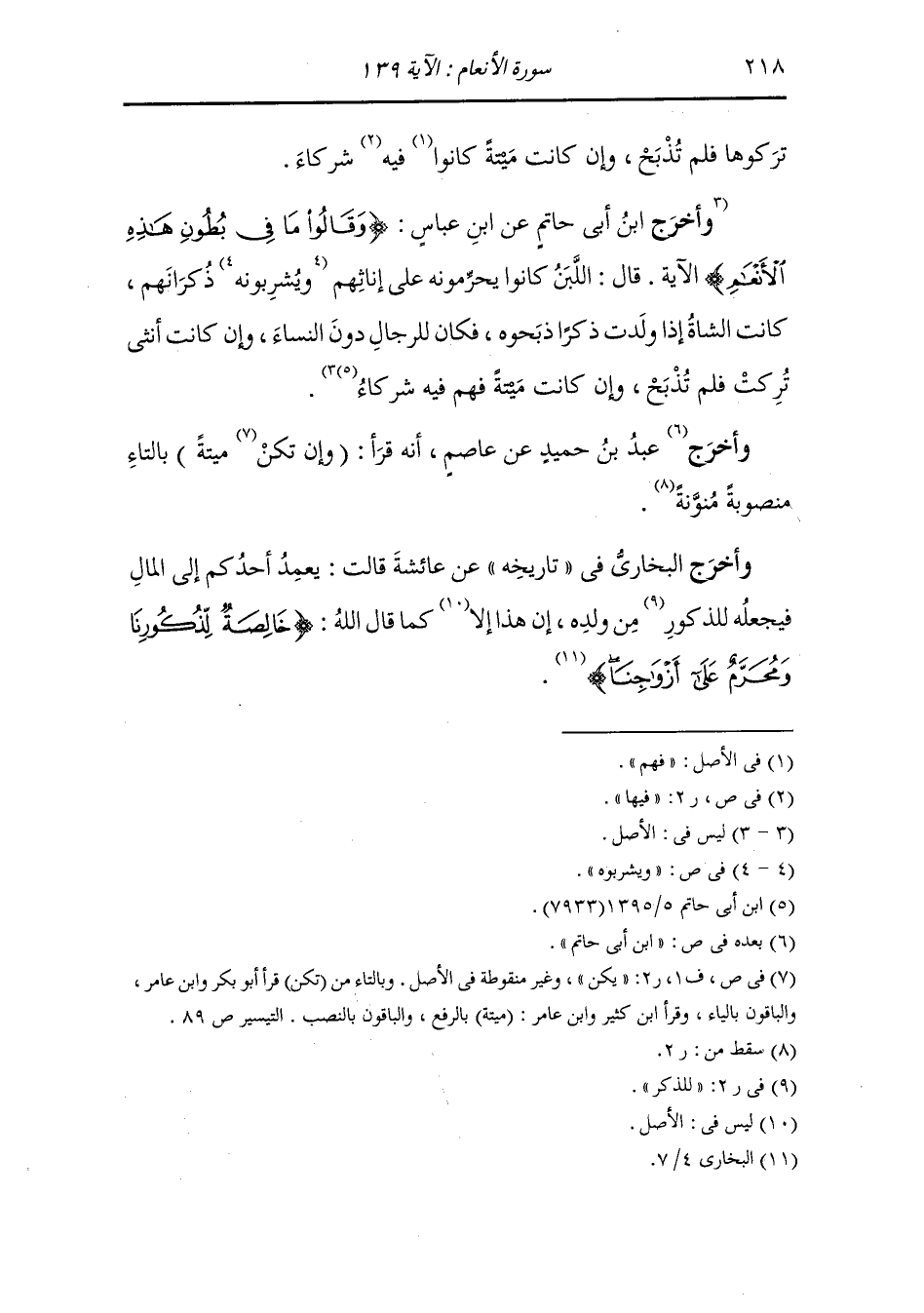 وأخرج البخاري في تاريخه عن عائشة قالت : يعمد أحدكم إلى المال فيجعله للذكور من ولده إن هذا إلا كما قال الله {خالصة لذكورنا ومحرم على أزواجنا}