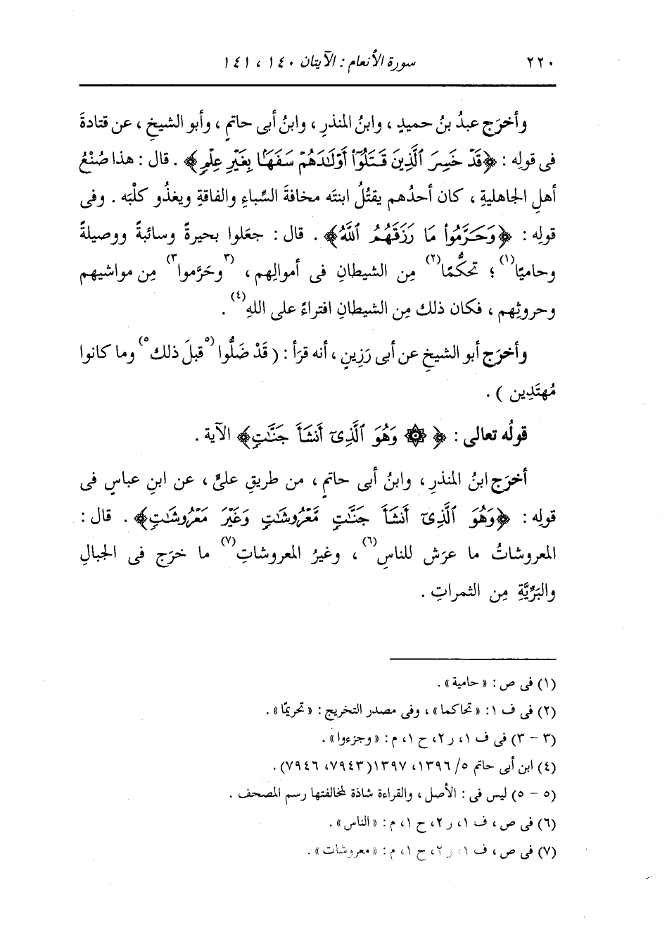 وأخرج عَبد بن حُمَيد ، وَابن المنذر ، وَابن أبي حاتم وأبو الشيخ عن قتادة في قوله {قد خسر الذين قتلوا أولادهم سفها بغير علم} قال : هذا صنع أهل الجاهلية كان أحدهم يقتل ابنته مخافة السباء والفاقة ويغذوا كلبه ، وفي قوله {وحرموا ما رزقهم الله} قال : جعلوا بحيرة وسائبة ووصيلة وحاميا تحكما من الشيطان في أموالهم وجزؤا من مواشيهم وحروثهم فكان ذلك من الشيطان افتراء على الله.