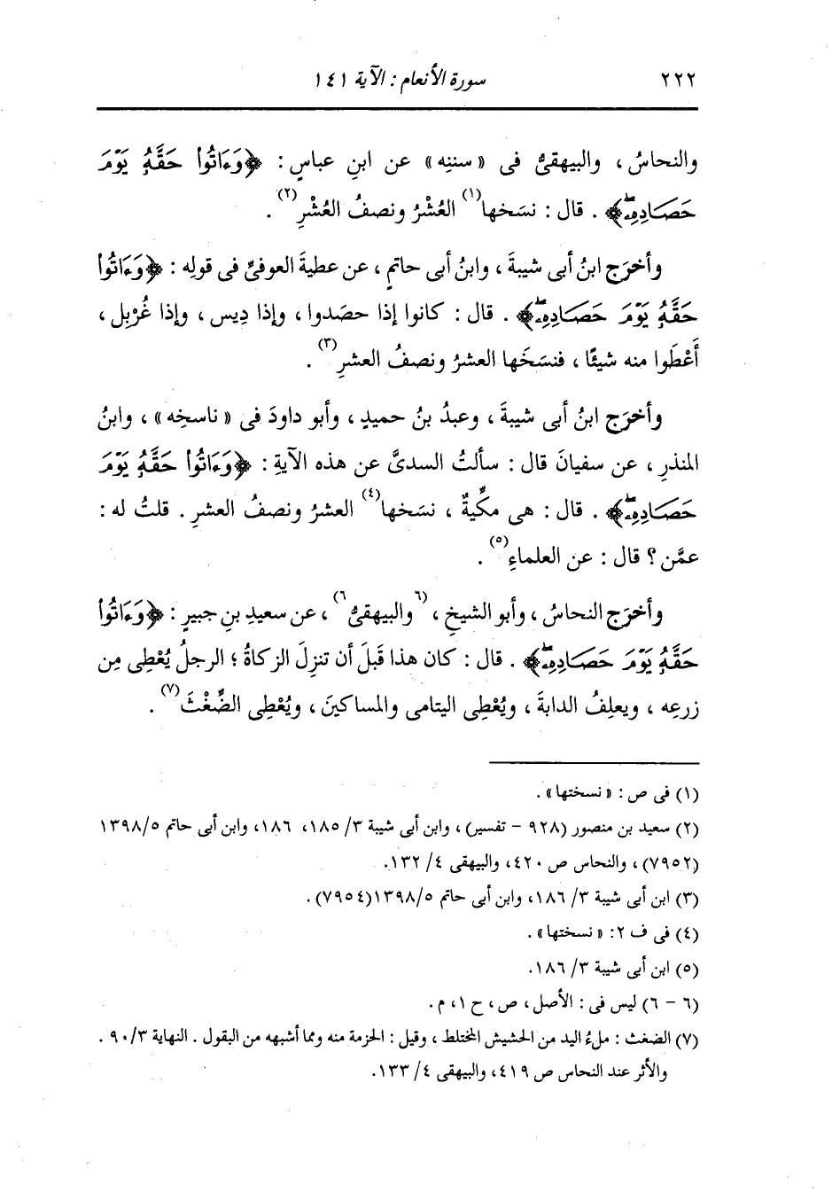 والنحاس والبيهقي في "سُنَنِه" عن ابن عباس {وآتوا حقه يوم حصاده} قال : نسخها العشر ونصف العشر.