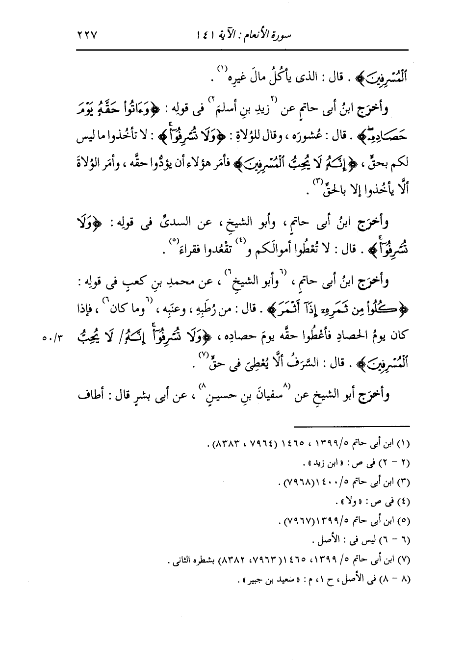 وأخرج ابن أبي حاتم عن زيد بن أسلم في قوله {وآتوا حقه يوم حصاده} قال : عشورة ، وقال للولاة {ولا تسرفوا} لا تأخذوا ما ليس لكم بحق {إنه لا يحب المسرفين} فأمر هؤلاء أن يؤدوا حقه وأمر الولاة أن لا يأخذوا إلا بالحق.