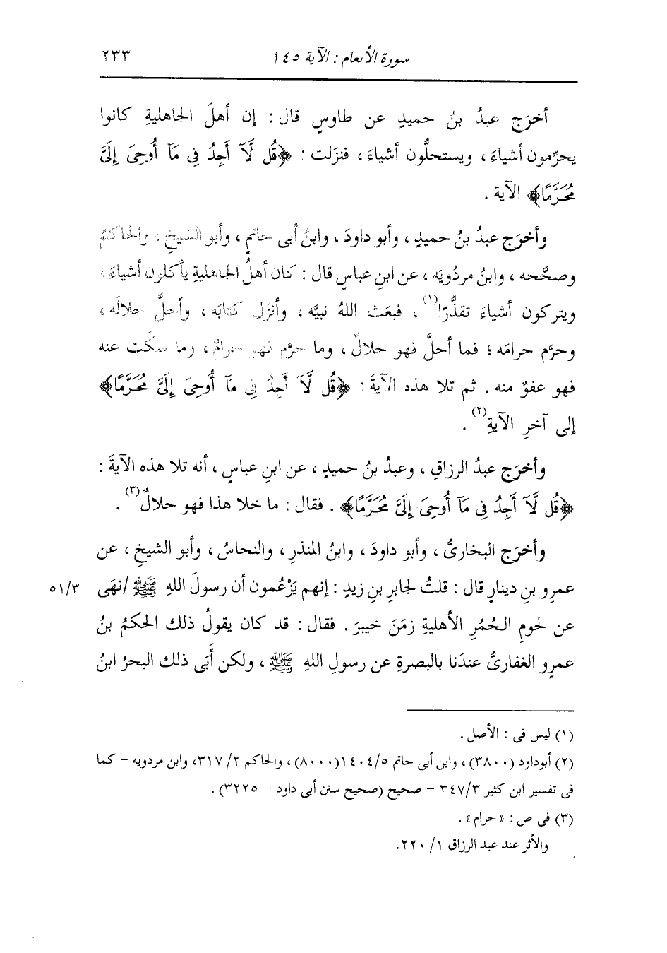 وأخرج عبد الرزاق ، وعَبد بن حُمَيد عن ابن عباس أنه تلا هذه الآية {قل لا أجد فيما أوحي إلي محرما} فقال : ما خلا هذا فهو حلال.