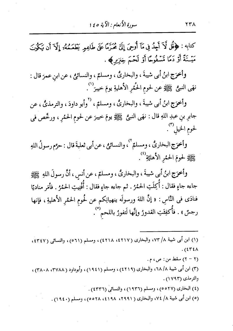 وأخرج ابن أبي شيبة والبخاري ومسلم والنسائي عن ابن عمر قال نهى النَّبِيّ صلى الله عليه وسلم عن لحوم الحمر الأهلية يوم خيبر.