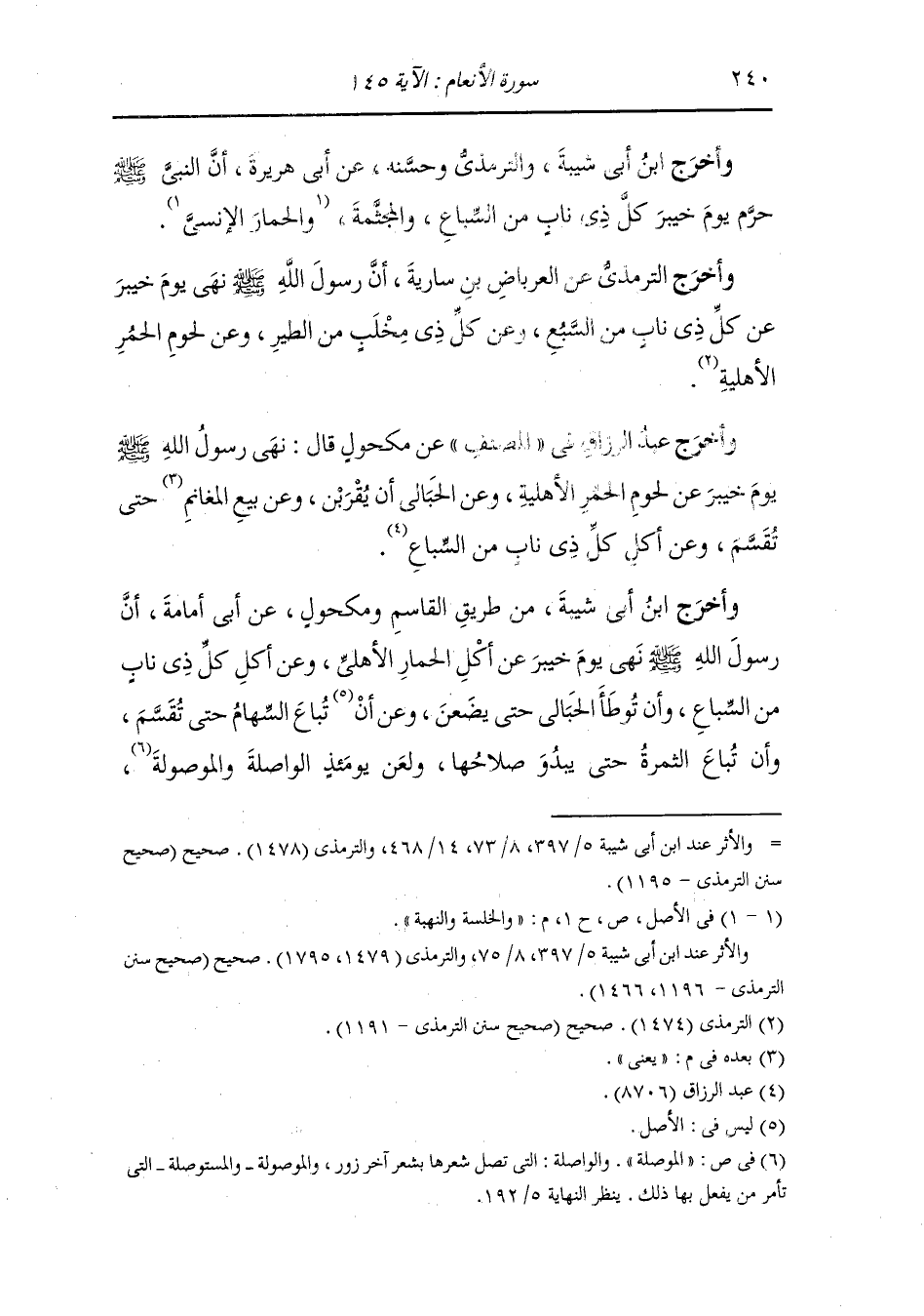 وأخرج الترمذي عن العرباض بن سارية أن رسول الله صلى الله عليه وسلم نهى يوم خيبر عن كل ذي ناب من السبع وعن كل ذي مخلب من الطير وعن لحم الحمر الأهلية.