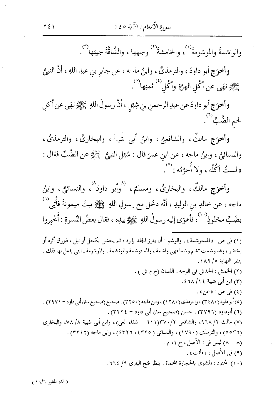 وأخرج مالك والبخاري ومسلم والنسائي ، وَابن ماجه عن خالد بن الوليد أنه دخل مع رسول الله صلى الله عليه وسلم بيت ميمونة فأتى بضب محنوذ فأهوى إليه رسول الله صلى الله عليه وسلم بيده فقال : بعض النسوة أخبروا
