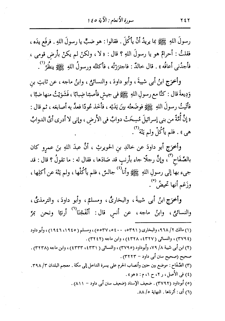 وأخرج ابن أبي شيبة والبخاري ومسلم وأبو داود والترمذي والنسائي ، وَابن ماجه عن أنس قال : أنفجنا أرنبا ونحن بمر