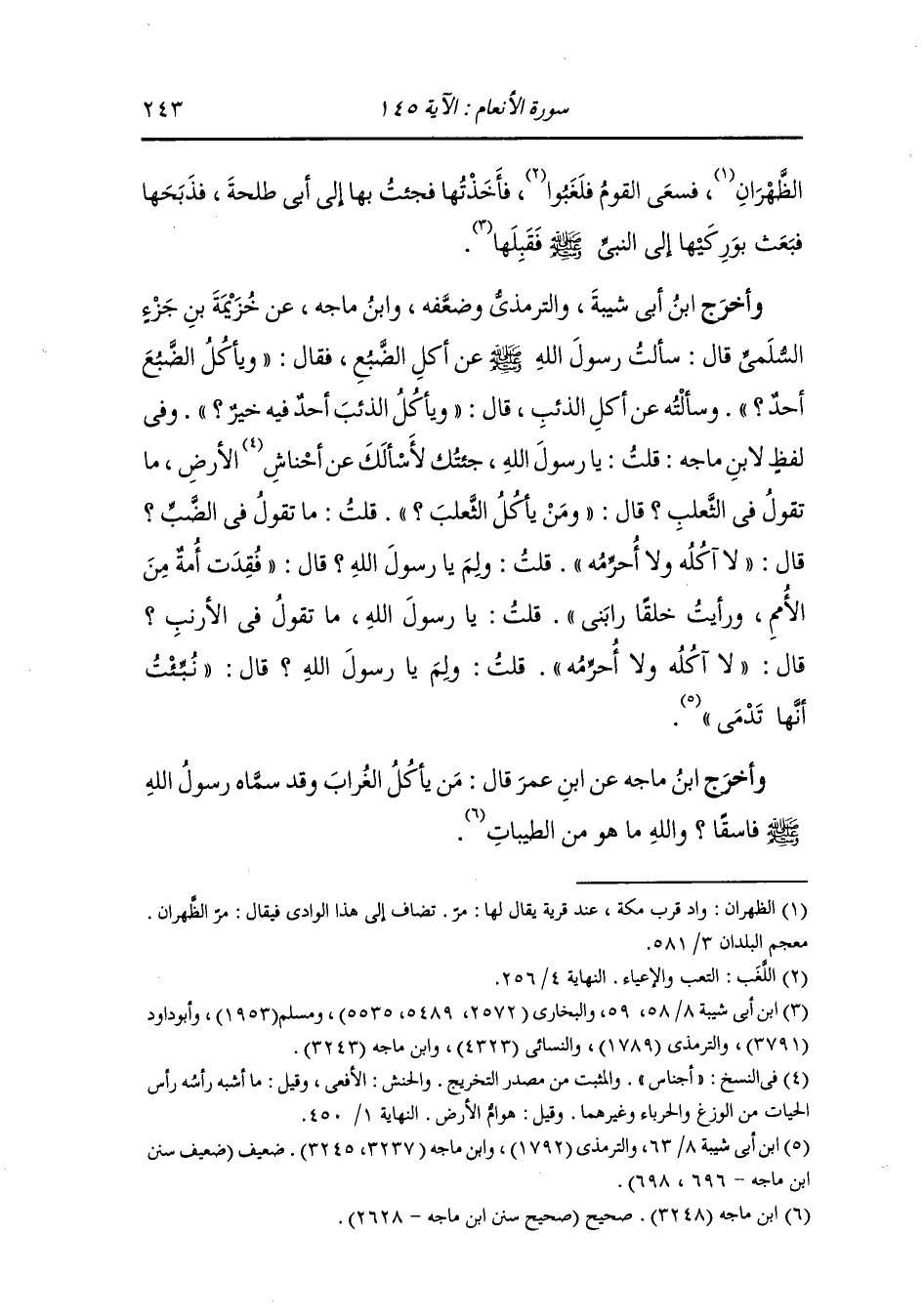 وأخرج ابن أبي شيبة والترمذي وضعفه ، وَابن ماجه عن خزيمة بن جزى ء السلمي قال سألت رسول الله صلى الله عليه وسلم عن أكل الضبع فقال : ويأكل الضبع أحد وسألته عن أكل الذئب قال : ويأكل الذئب أحد فيه خير وفي لفظ لابن ماجه : قلت : يا رسول الله جئتك لأسألك عن أجناس الأرض ما تقول في الثعلب قال : ومن يأكل الثعلب قلت : ما تقول في الضب قال : لا آكله ولا أحرمه ، قلت : ولم يا رسول الله قال : فقدت أمة من الأمم ورأيت خلقا رابني ، قلت : يا رسول الله ما تقول في الأرنب قال : لا آكله ولا أحرمه ، قلت : ولم يا رسول الله قال : نبئت أنها تدمى.