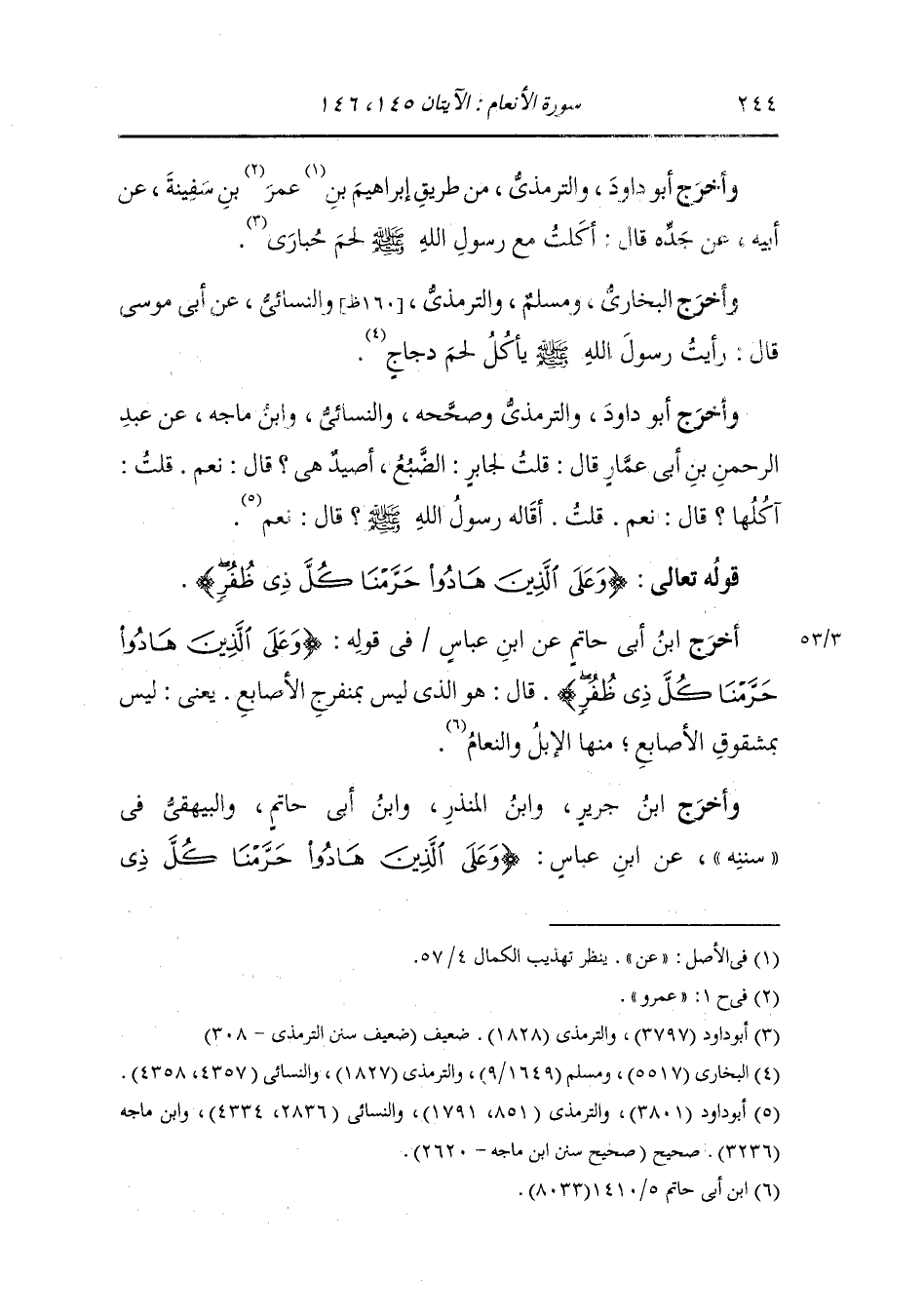 أَخْرَج ابن أبي حاتم عن ابن عباس في قوله {وعلى الذين هادوا حرمنا كل ذي ظفر} قال : هو الذي ليس بمنفرج الأصابع يعني ليس بمشقوق الأصابع منها الإبل والنعام.
