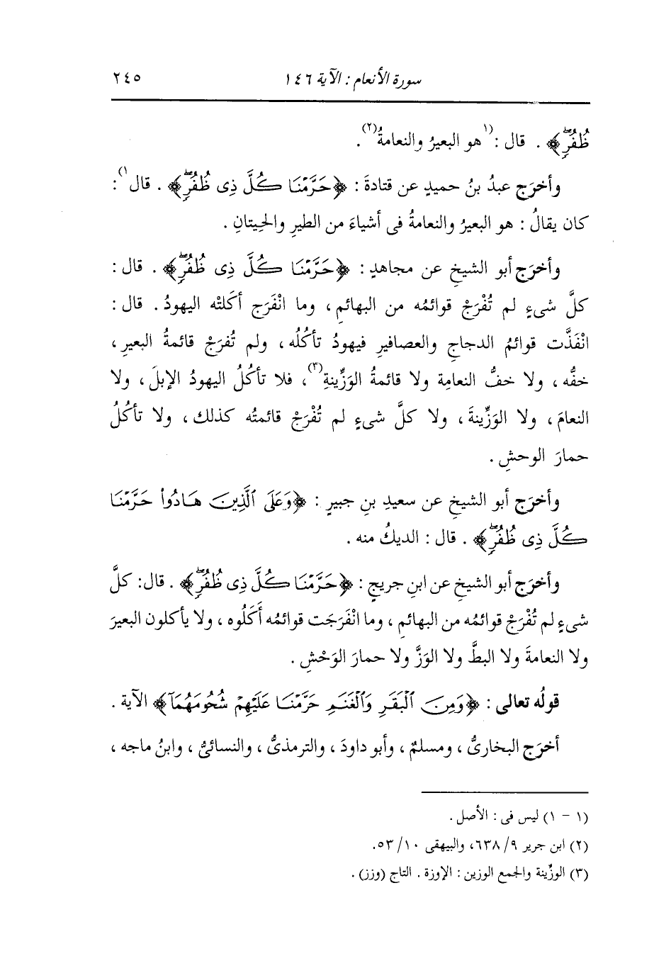 وأخرج أبو الشيخ عن ابن جريج {حرمنا كل ذي ظفر} قال : كل شيء لم تفرج قوائمه من البهائم وما انفرجت قوائمه أكلوه ولا يأكلون البعير ولا النعامة ولا البط ولا الوزر ولا حمار الوحش.