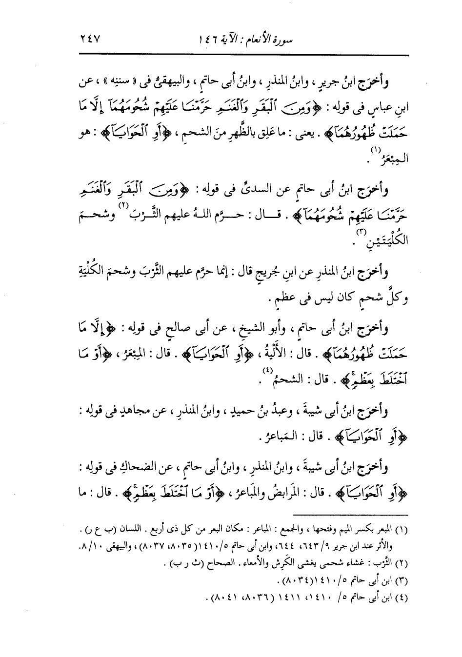 وأخرج ابن جرير ، وَابن المنذر ، وَابن أبي حاتم والبيهقي في "سُنَنِه" عن ابن عباس في قوله {ومن البقر والغنم حرمنا عليهم شحومهما إلا ما حملت ظهورهما} يعني ما علق بالظهر من الشحم {أو الحوايا} هو المبعر.