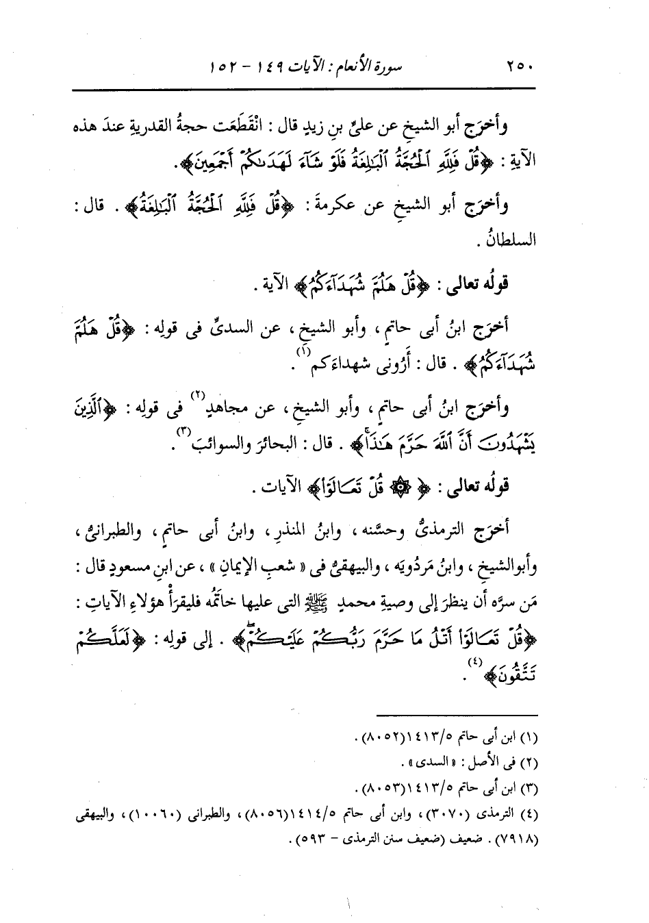 - أَخْرَج الترمذي وحسنه ، وَابن المنذر ، وَابن أبي حاتم والطبراني وأبو الشيخ ، وَابن مردويه والبيهقي في شعب الإيمان عن ابن مسعود قال : من سره أن ينظر إلى وصية محمد التي عليها خاتما فليقرأ هؤلاء الآيات {قل تعالوا أتل ما حرم ربكم عليكم} إلى قوله {لعلهم يتقون}