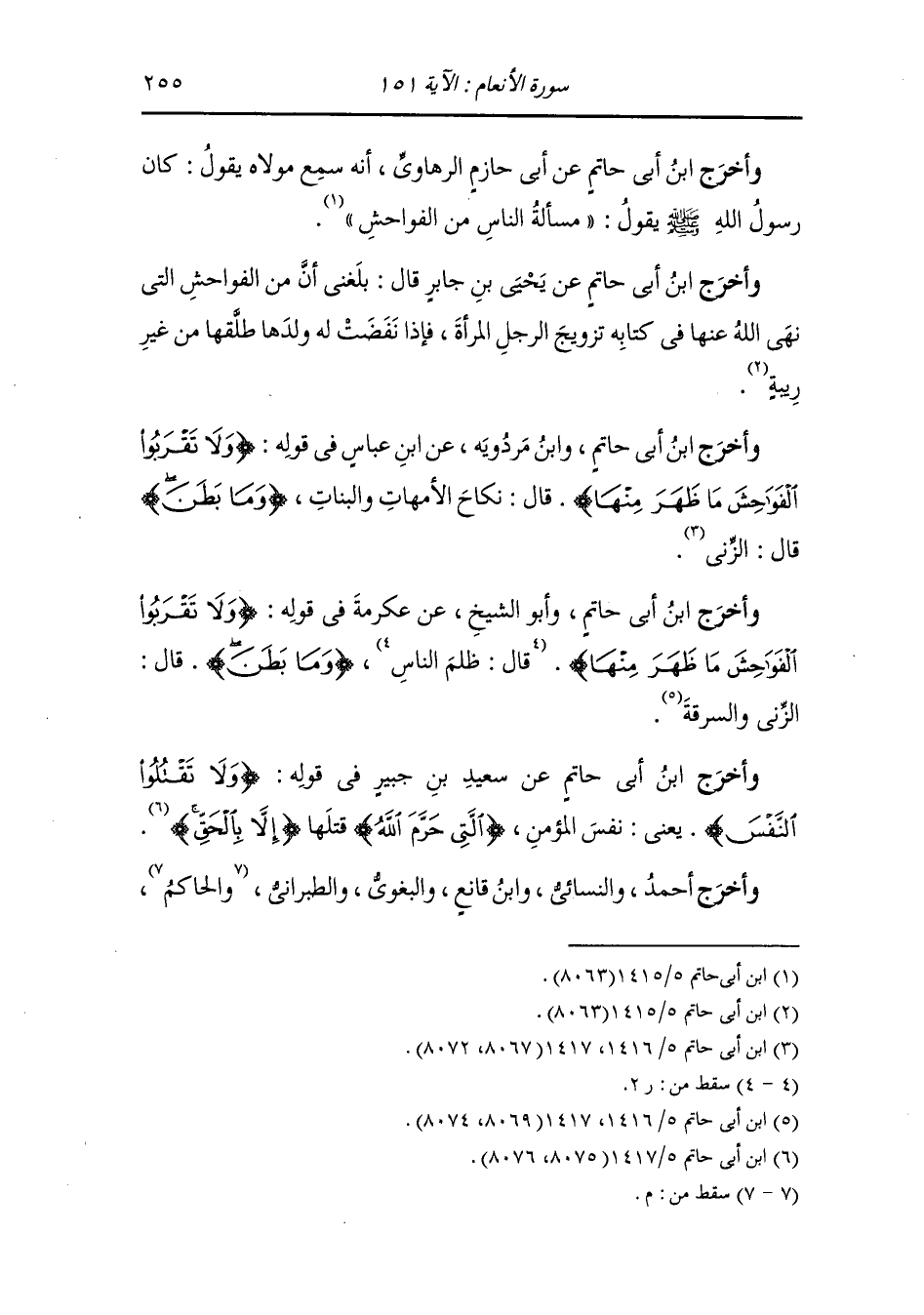 وأخرج ابن أبي حاتم عن ابن أبي حازم الرهاوي أنه سمع مولاه يقول : كان رسول الله صلى الله عليه وسلم يقول مسئله الناس من الفواحش.