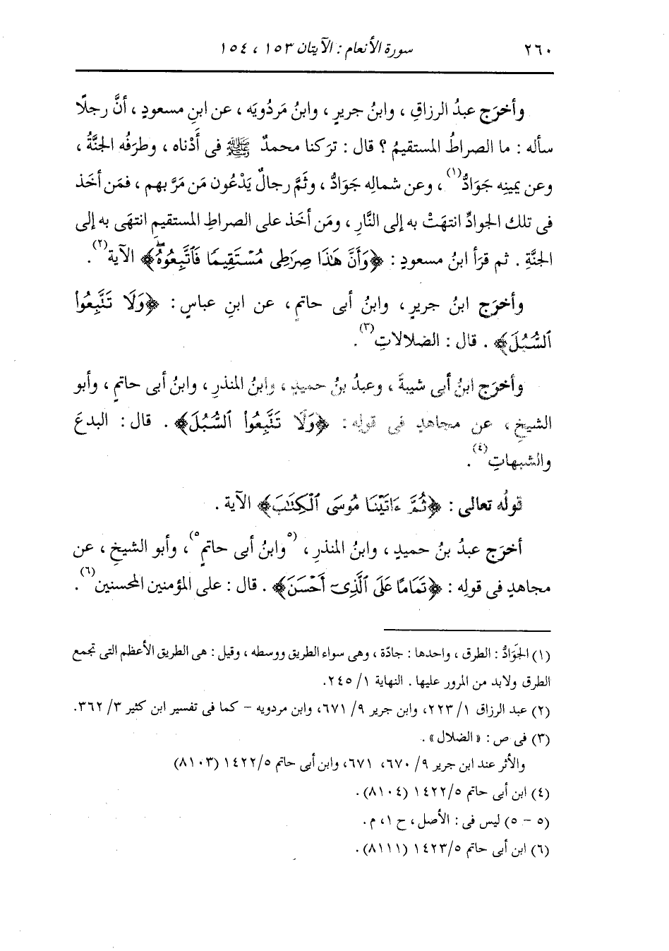 وأخرج عبد الرزاق ، وَابن جَرِير ، وَابن مردويه عن ابن مسعود أن رجلا سأله ما الصراط المستقيم قال : تركنا محمد صلى الله عليه وسلم في أدناه وطرفه الجنة وعن يمينه جواد وعن شماله جواد وثم رجال يدعون من مر بهم فمن أخذ في تلك الجواد انتهت به إلى النار ومن أخذ على الصراط المستقيم انتهى به إلى الجنة ثم قرأ ابن مسعود {وأن هذا صراطي مستقيما فاتبعوه} الآية.