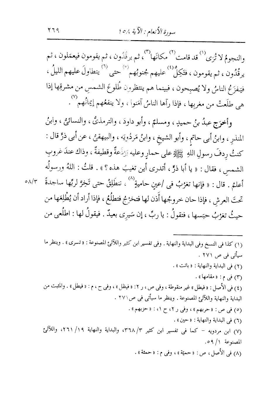 وأخرج عَبد بن حُمَيد ومسلم وأبو داود والترمذي والنسائي ، وَابن المنذر ، وَابن أبي حاتم وأبو الشيخ ، وَابن مردويه والبيهقي عن أبي ذر قال : كنت ردف رسول الله صلى الله عليه وسلم على حمار وعليه بردعة وقطيفة وذاك عند غروب الشمس فقال : يا أبا ذر أتدري أين تغيب هذه قلت : الله ورسوله أعلم ، قال : فإنها تغرب في عين حمئة تنطلق حتى تخر لربها ساجدة تحت العرش فإذا حان خروجها أذن لها فتخرج فتطلع فإذا أراد أن يطلعها من حيث تغرب حبسها فتقول : يا رب إن سيري بعيد فيقول لها : اطلعي من