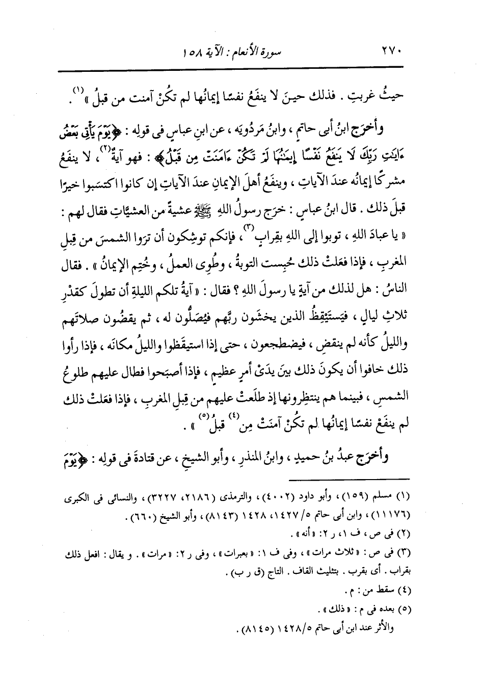 ابن عباس : خرج رسول الله صلى الله عليه وسلم عشية من العشيات فقال لهم يا عباد الله توبوا إلى الله بقراب فإنكم توشكون أن تروا الشمس من قبل المغرب فإذا فعلت ذلك حبست التوبة وطوى العمل وختم الإيمان ، فقال الناس : هل لذلك من آية يا رسول الله فقال : آية تلكم الليلة أن تطول كقدر ثلاث ليال فيستيقظ الذين يخشون ربهم فيصلون له ثم يقضون صلاتهم والليل كأنه لم ينقض فيضطجعون حتى إذا استيقظوا والليل مكانه فإذا رأوا ذلك خافوا أن يكون ذلك بين يدي أمر عظيم فإذا أصبحوا فطال عليهم طلوع الشمس فبينما هم ينتظرونها إذ طلعت عليهم من قبل المغرب فإذا فعلت ذلك لم ينفع نفسا إيمانها لم تكن آمنت قبل ذلك.