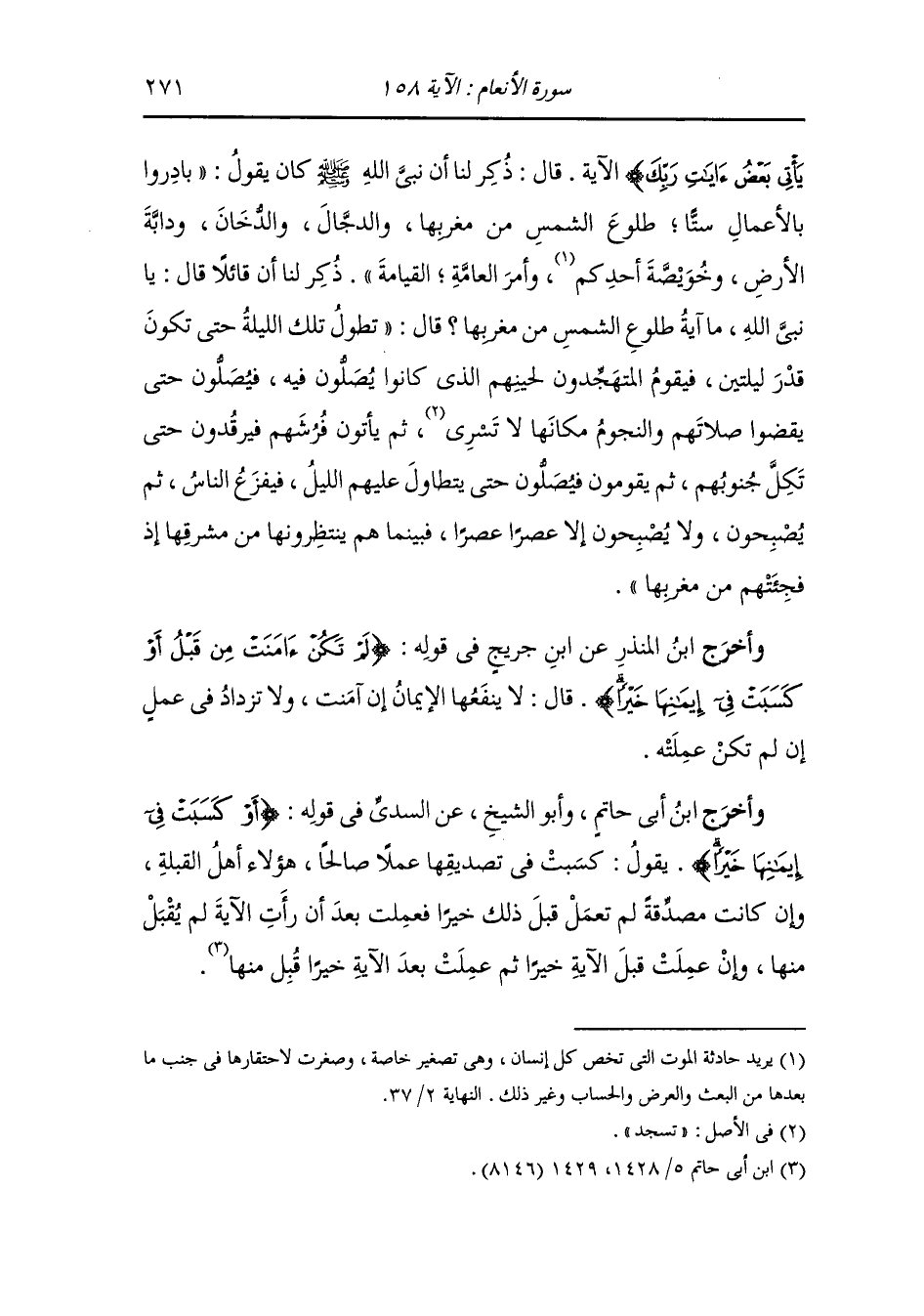 يأتي بعض آيات ربك} الآية ، قال : ذكر لنا أن نبي الله صلى الله عليه وسلم كان يقول بادروا بالأعمال ستا : طلوع الشمس من مغربها والدجال والدخان ودابة الأرض وخويصة أحدكم وأمر العامة ، القيامة ذكر لنا أن قائلا قال : يا نبي الله ما آية طلوع الشمس من مغربها قال : تطول تلك الليلة حتى تكون قدر ليلتين ، فيقوم المتهجدون لحينهم الذي كانوا يصلون فيه فيصلون حتى يقضوا صلاتهم والنجوم مكانها لا تسري ثم يأتون فرشهم فيرقدون حتى تكل جنوبهم ثم يقومون فيصلون حتى يتطاول عليهم الليل فيفزع الناس ثم يصبحون ولا يصبحون إلا عصرا عصرا فبينما هم ينتظرونها من مشرقها إذ فجئتهم من مغربها.