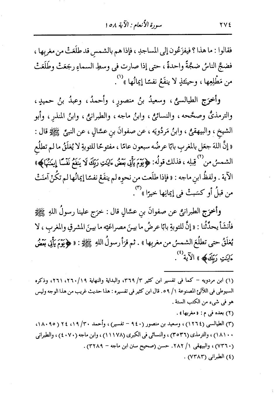 وأخرج الطيالسي وسعيد بن منصور وأحمد ، وعَبد بن حُمَيد والترمذي وصححه والنسائي ، وَابن ماجه والطبراني ، وَابن المنذر وأبو الشيخ والبيهقي ، وَابن مردويه عن صفوان بن عسال عن النَّبِيّ صلى الله عليه وسلم قال إن الله جعل بالمغرب بابا عرضه سبعون عاما مفتوحا للتوبة لا يغلق ما لم تطلع الشمس من مغربها قبله فذلك قوله {يوم يأتي بعض آيات ربك لا ينفع نفسا إيمانها} ولفظ ابن ماجة : فإذا طلعت من نحوه لم ينفع نفسا إيمانها لم تكن آمنت من قبل أو كسبت في إيمانها خيرا.