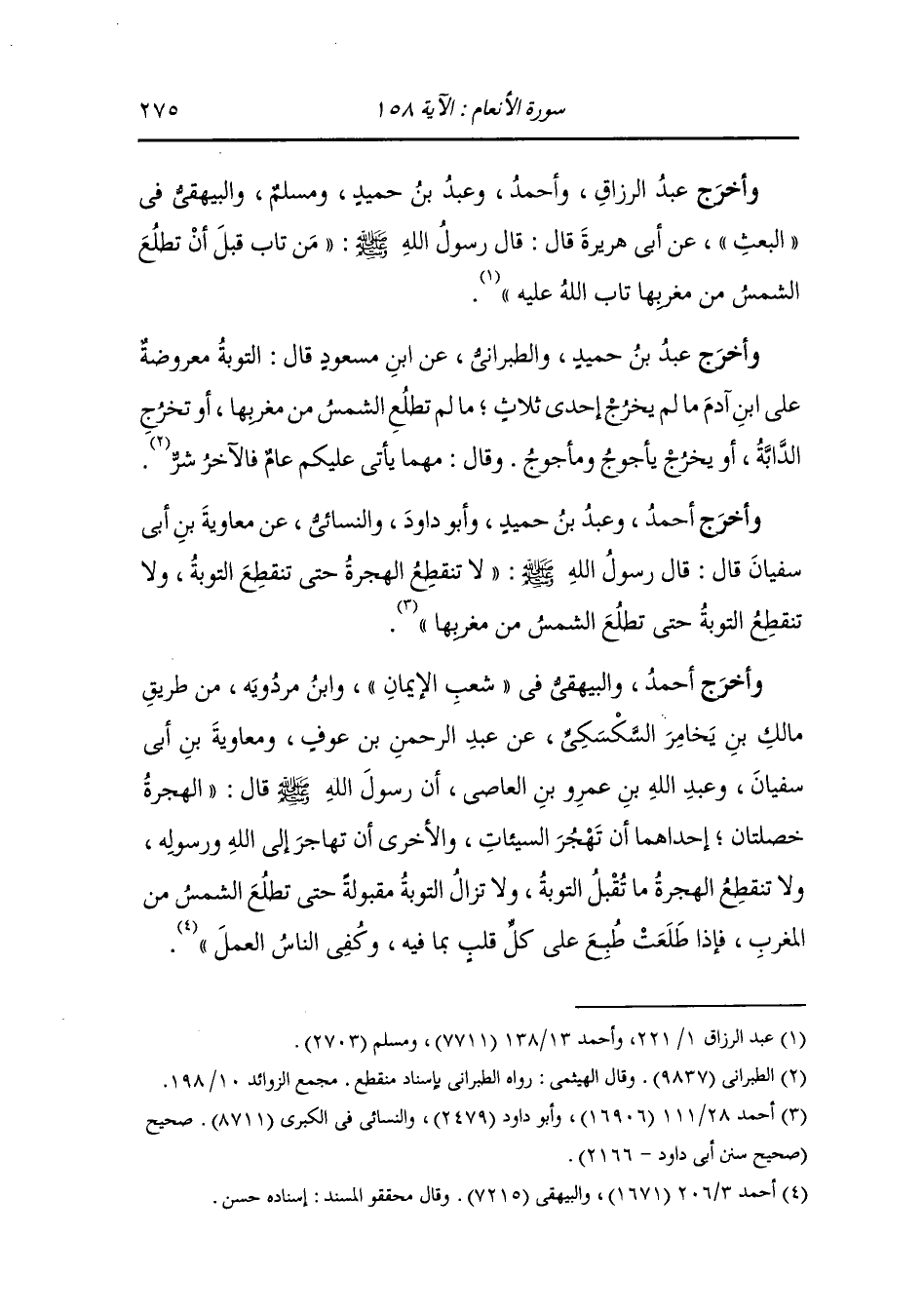 وأخرج أحمد ، وعَبد بن حُمَيد وأبو داود والنسائي عن معاوية بن أبي سفبان قال : قال رسول الله صلى الله عليه وسلم لا تنقطع الهجرة حتى تنقطع التوبة ولا تنقطع التوبة حتى تطلع الشمس من مغربها.