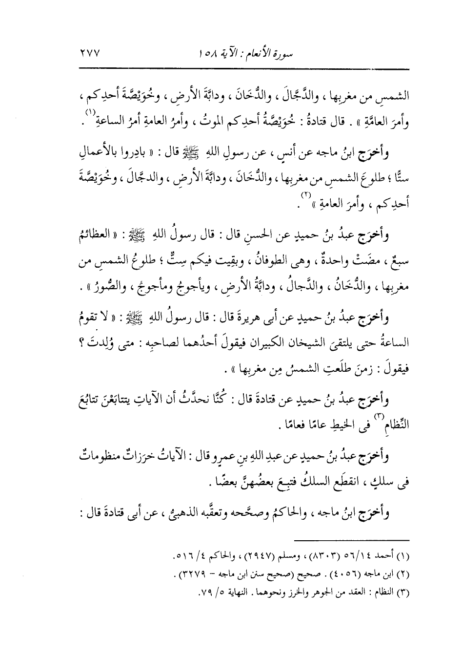 وأخرج عَبد بن حُمَيد عن أبي هريرة قال : قال رسول الله صلى الله عليه وسلم لا تقوم الساعة حتى يلتقي الشيخان الكبيران فيقول أحدهما لصاحبه : متى ولدت فيقول : زمن طلعت الشمس من مغربها.