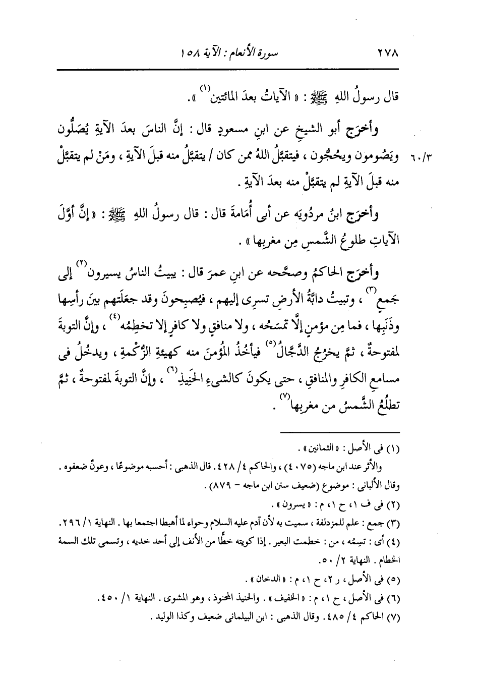وأخرج الحاكم وصححه عن ابن عمر قال : يبيت الناس يسرون إلى جمع وتبيت دابة الأرض تسرى إليهم فيصبحون وقد جعلتهم بين رأسها وذنبها فما من مؤمن إلا تمسحه ولا منافق ولا كافر إلا تخطمه وإن التوبة لمفتوحة ثم يخرج الدخان فيأخذ المؤمن منه كهيئة الزكمة ويدخل في مسامع الكافر والمنافق حتى يكون كالشيء الخفيف وإن التوبة لمفتوحة ثم تطلع الشمس من مغربها
