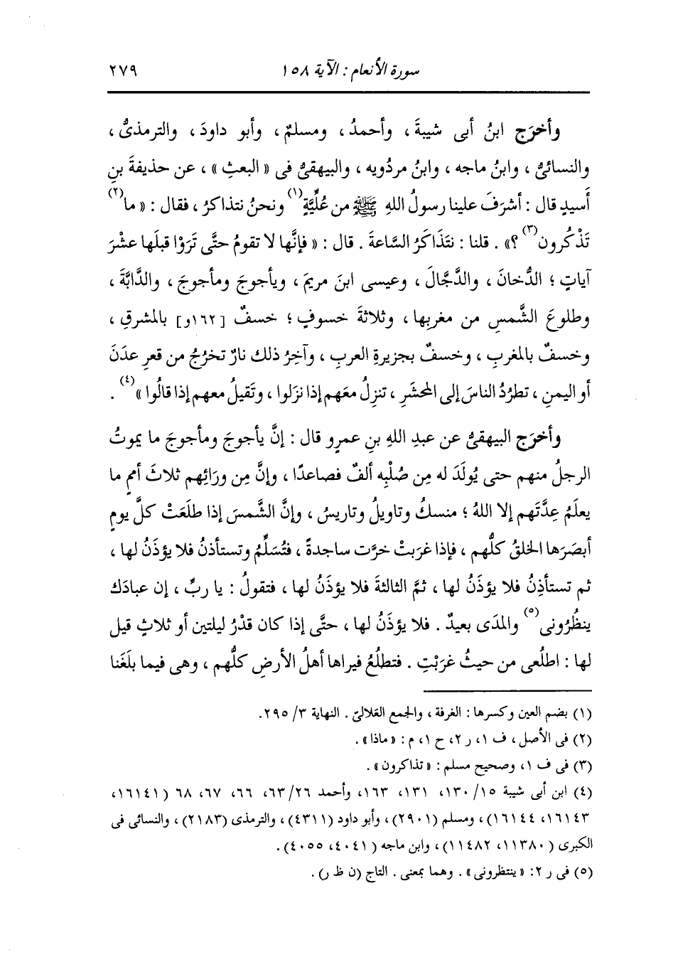 وأخرج البيهقي عن عبد الله بن عمرو قال : إن يأجوج ومأجوج ما يموت الرجل منهم حتى يولد له من صلبه ألف فصاعدا وإن من ورائهم ثلاث أمم ما يعلم عدتهم إلا الله تعالى منسك وتأويل وتاريس وإن الشمس إذا طلعت كل يوم أبصرها الخلق كلهم فإذا غربت خرت ساجدة فتسلم وتستأذن فلا يؤذن لها ثم تستأذن فلا يؤذن لها ثم الثالثة فلا يؤذن لها فتقول : يا رب إن عبادك ينظروني والمدى بعيد فلا يؤذن لها حتى إذا كان قدر ليلتين أو ثلاث قيل لها : اطلعي من حيث غربت فتطلع فيراها أهل الأرض كلهم وهي فيما بلغنا