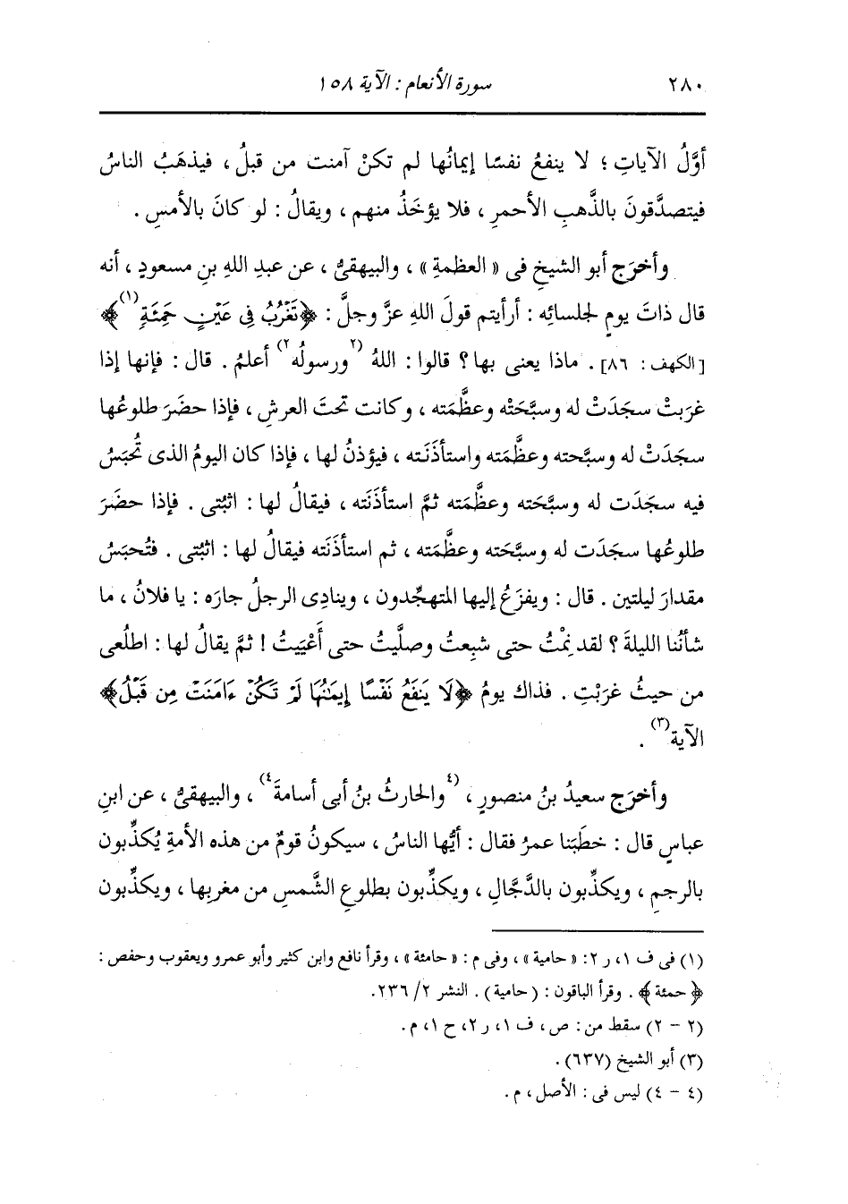 وأخرج أبو الشيخ في العظمة والبيهقي عن عبد الله بن مسعود أنه قال : ذات يوم لجلسائه : أرأيتم قول الله عز وجل {تغرب في عين حمئة} الكهف الآية 86 ماذا يعني بها قالوا : الله أعلم قال : إذا غربت سجدت له وسبحته وعظمته وكانت تحت العرش فإذا حضر طلوعها سجدت له وسبحته وعظمته واستأذنته فيؤذن لها فإذا كان اليوم الذي تحبس فيه سجدت له وسبحته وعظمته ثم استأذنته فيقال لها : أثبتي ، فإذا حضر طلوعها سجدت له وسبحته وعظمته ثم استأذنته فيقال لها : أثبتي ، فتحبس مقدار ليلتين قال : ويفزع إليها المتهجدون وينادي الرجل جاره يا فلان ما شأننا الليلة لقد نمت حتى شبعت وصليت حتى أعيت ثم يقال لها : اطلعي من حيث غربت ، فذاك {يوم يأتي بعض آيات ربك لا ينفع نفسا إيمانها لم تكن آمنت من قبل} الآية.